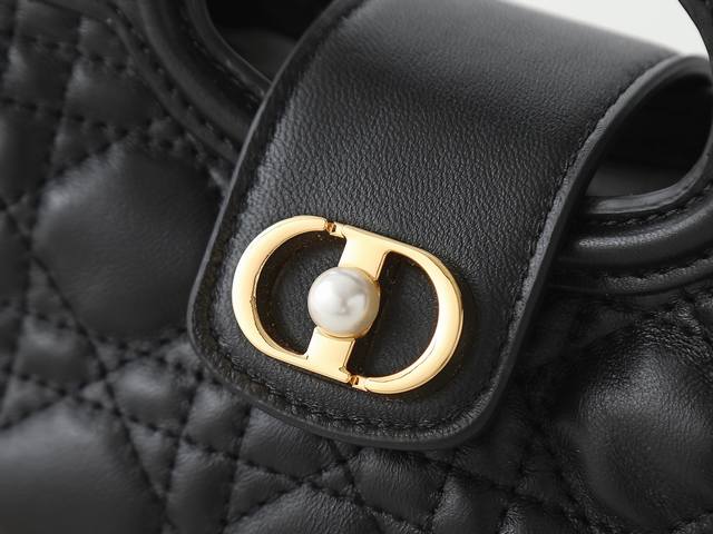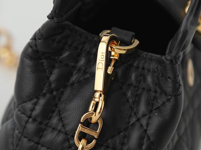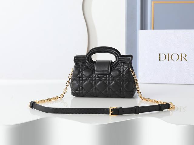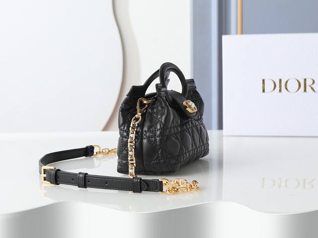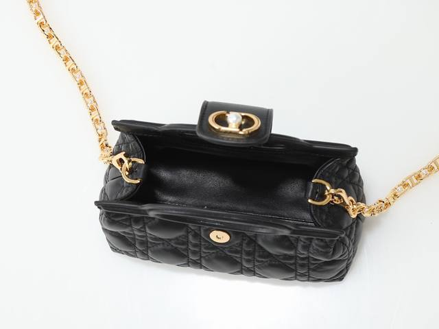 Style No. 3123 Black Mini Chain Handbag, crafted from black lambskin with a prominent cannage pattern, featuring a gold-plated metal Cd logo on the flap. Comfortable to carry by hand, over the shoulder, or crossbody. Dimensions: 18.5cm-13cm-8.5cm.