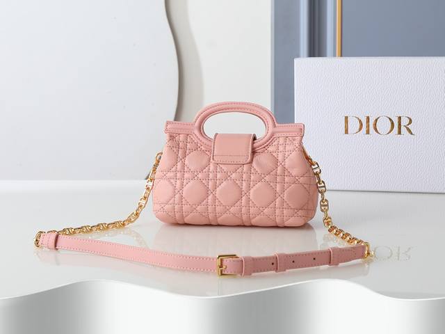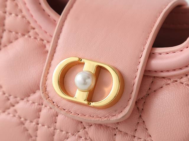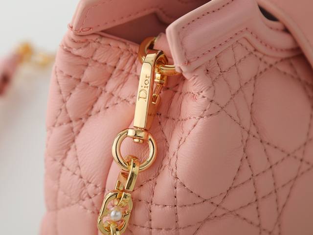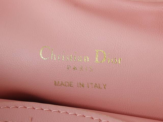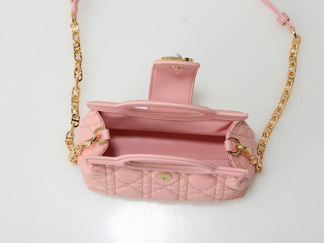 Style No. 3123 Pink Mini Chain Handbag, crafted from blush pink lambskin, featuring a prominent cannage pattern and a gold-finished Cd logo on the flap. Comfortable to carry by hand, over the shoulder, or crossbody. Dimensions: 18.5cm-13cm-8.5cm.