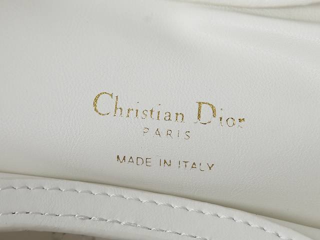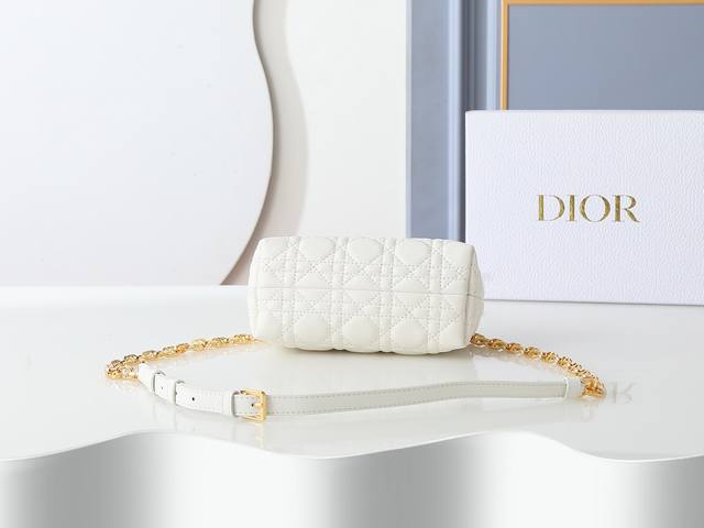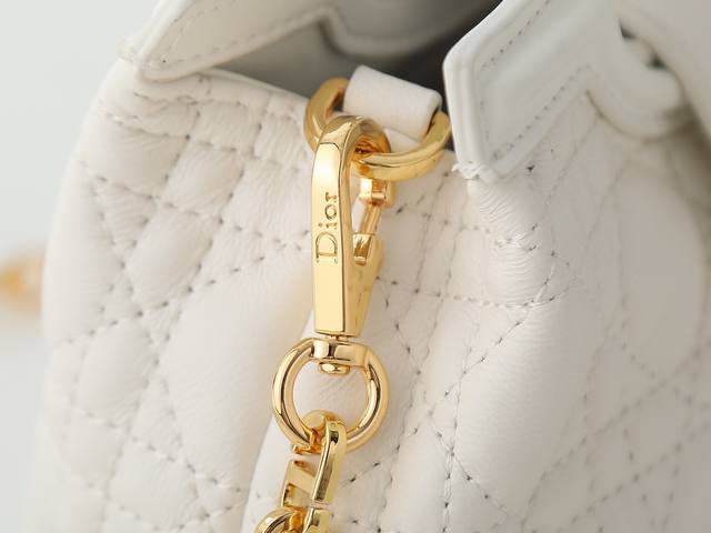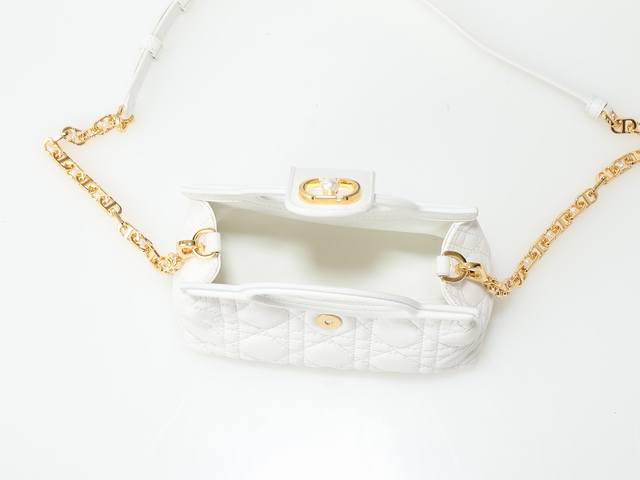 Style No. 3123 White Mini Chain Handbag, crafted from white lambskin with a prominent cannage pattern, featuring a gold-plated metal Cd logo on the flap. Comfortable to carry by hand, over the shoulder, or crossbody. Dimensions: 18.5cm-13cm-8.5cm.