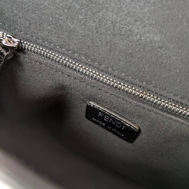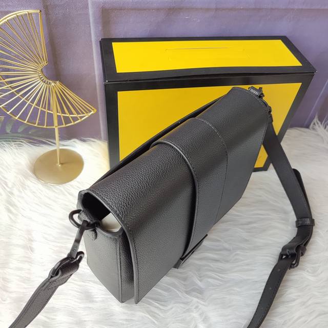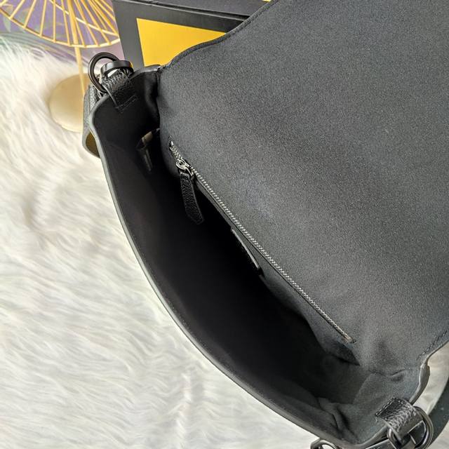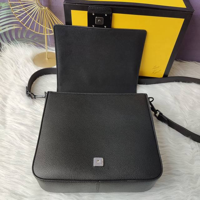 Style No. 7Va537 Baguette Medium Messenger Bag is made of black lychee leather with a flap and magnetic Ff buckle, an inner zipper pocket and the same color lacquered metal accessories, and an adjustable and detachable shoulder strap for shoulder or crossbody use. Size 26cm-22cm-8cm