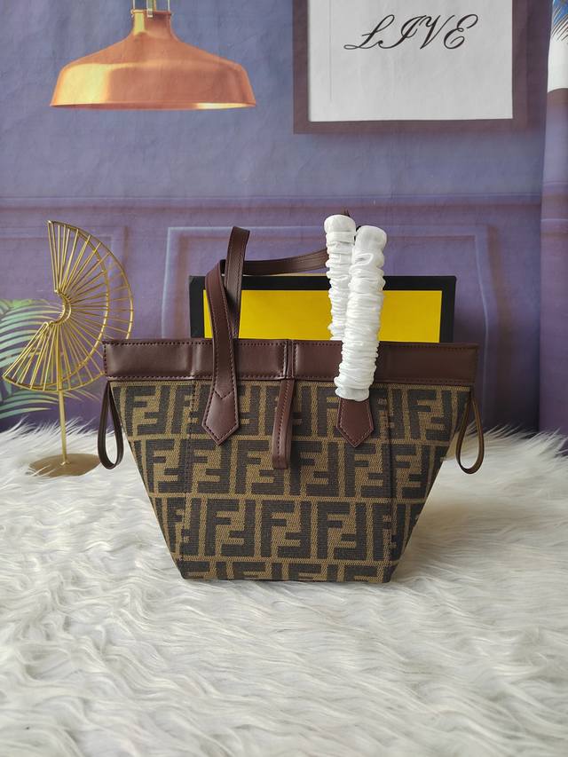 Style No. 8Bs083 Coffee jacquard fabric and leather, style bucket bag, equipped with a strap with a metal key clip, size 18.5Cm-15Cm-15Cm