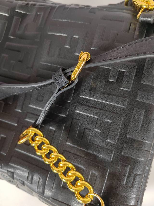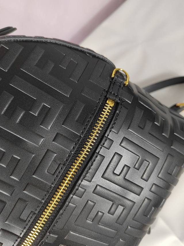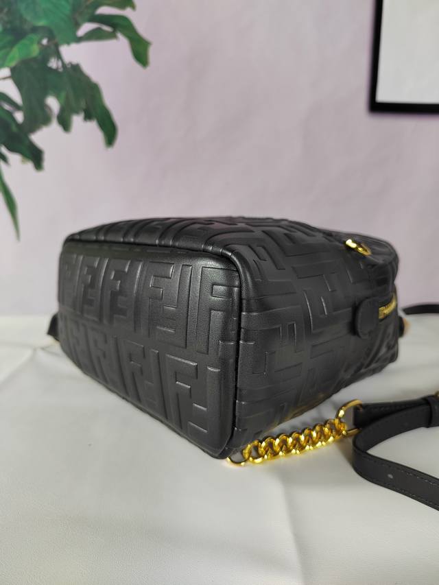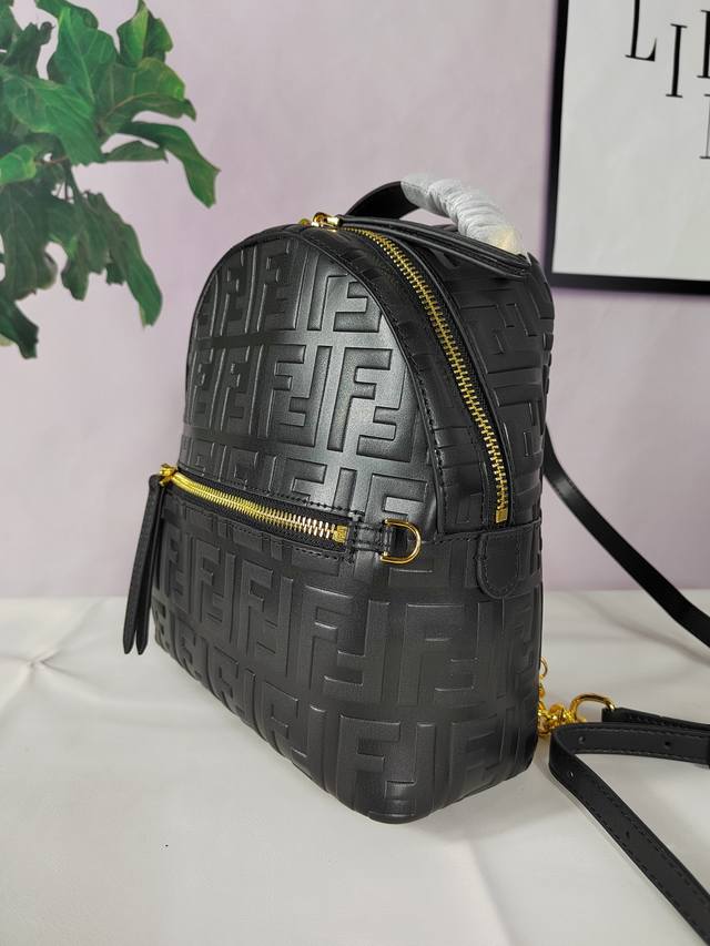 Style No. 8Bz038 Black backpack with embossed Ff pattern, double pull zipper, front zipper pocket and gold hardware, two adjustable leather spaghetti straps and chain details, size 25cm-21cm-10cm