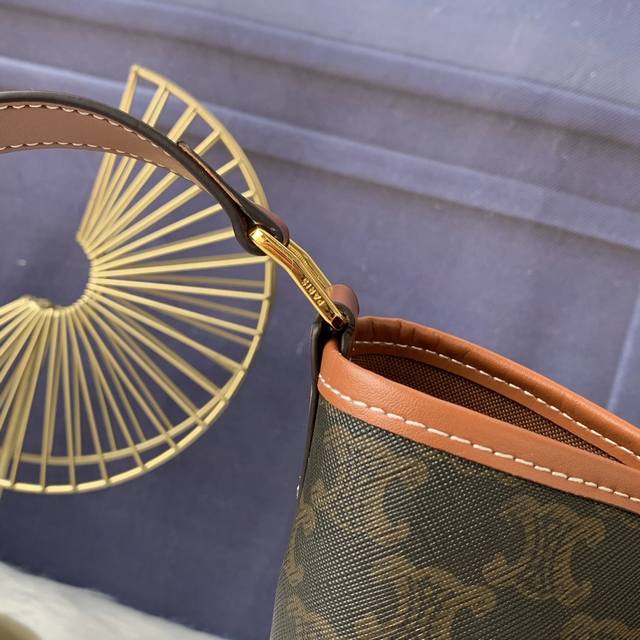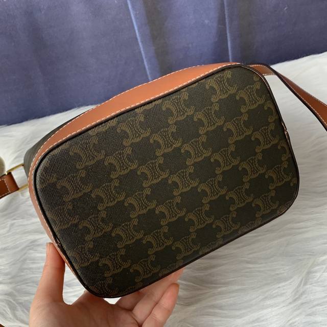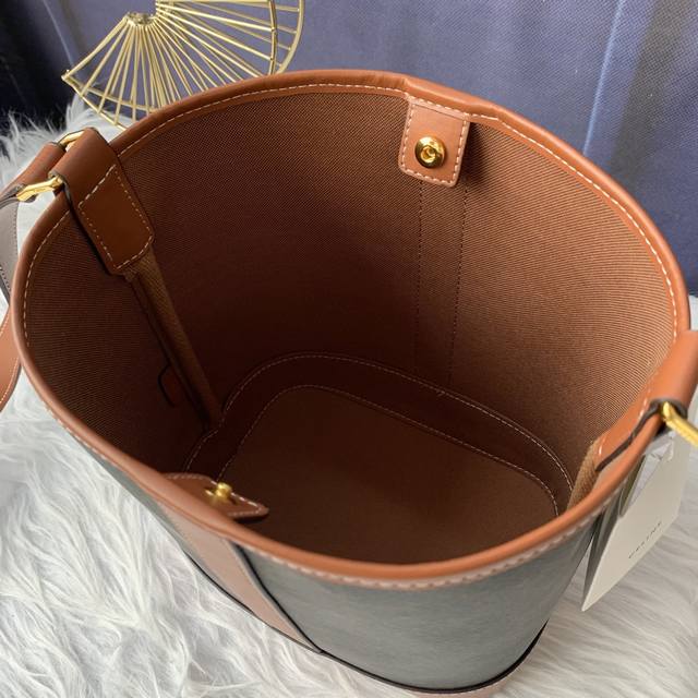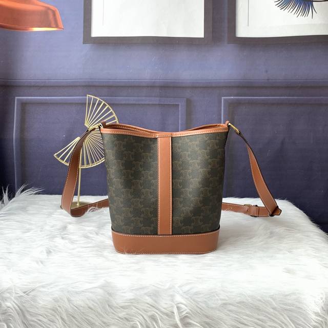 Style No. C191442 Small logo print bucket bag, artificial leather cowhide, cabinet fabric, crossbody and shoulder strap, snap closure adjustable shoulder strap length 50cm Dimensions: 30cmx22cmx13cm