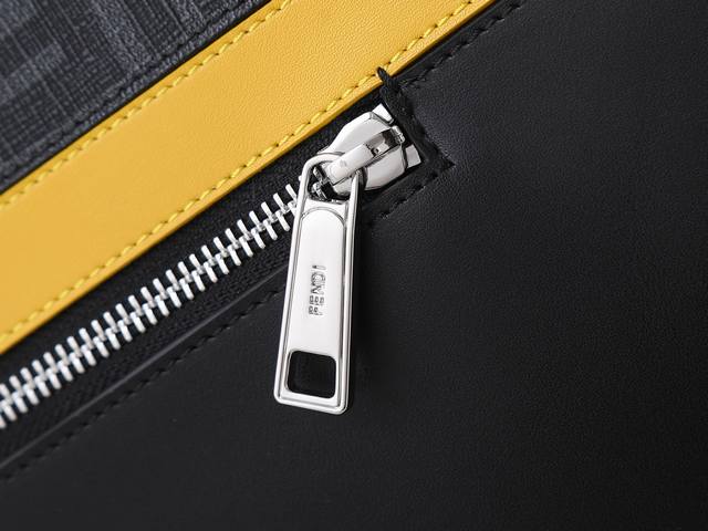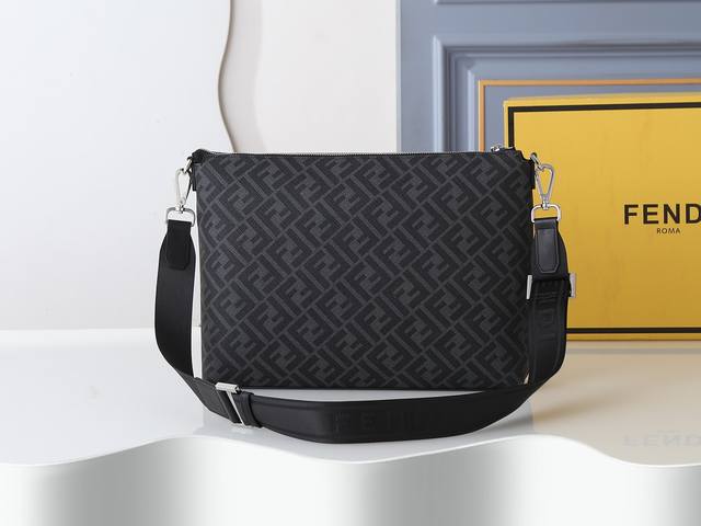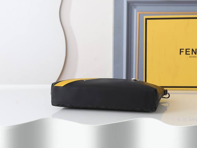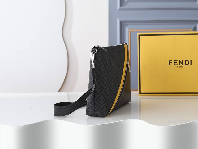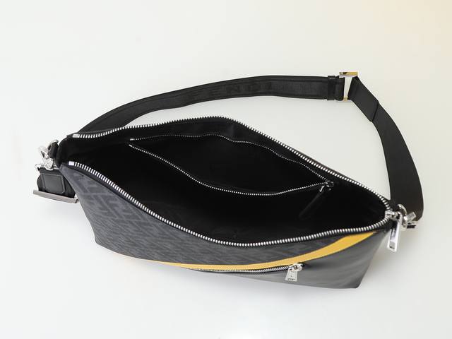 Style No. F7Va Black floral print, slim messenger bag with a zippered central compartment and an interior zippered pocket. Adjustable and detachable shoulder strap. Decorated with an Ff pattern and yellow detailing. Dimensions: 34cm