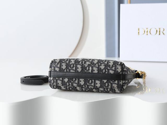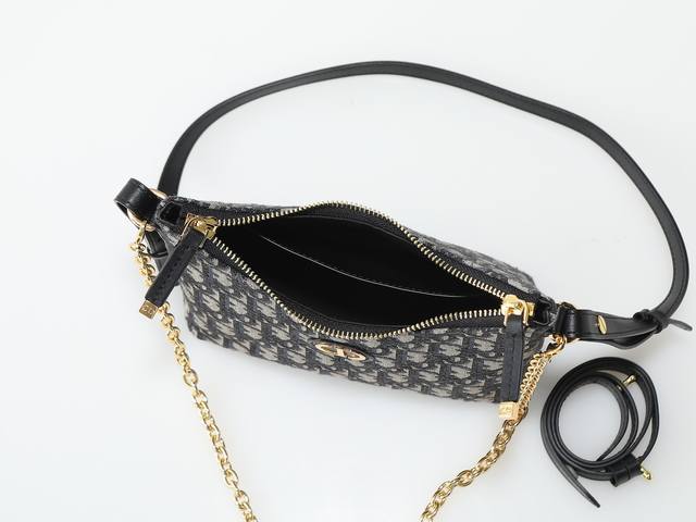 Style number S5253 is carefully crafted from black Oblique printed fabric and other materials, and the front is embellished with a gold-finished metal Cd logo to enhance the style. It is equipped with a zipper compartment, an adjustable and detachable leather shoulder strap and a top handle, and a detachable chain for shoulder or crossbody use. Size: 21Cm-17Cm-7Cm