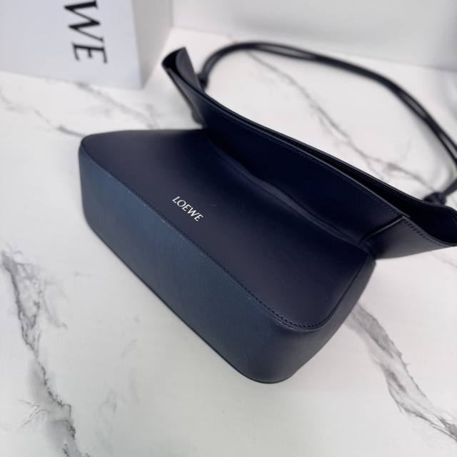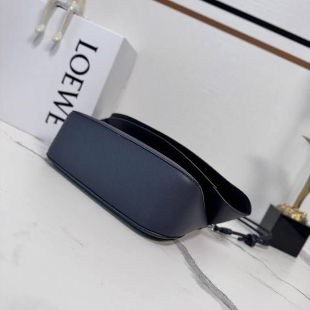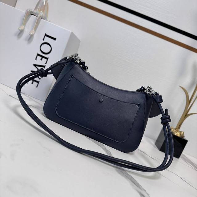 The Loeola is a soft, lightweight, and versatile summer bag featuring a curved body, a sleek flap closure, and a stylish donut-shaped chain. This medium-sized version is crafted from smooth calfskin. Features include a detachable tubular calfskin shoulder strap, a detachable donut-shaped chain, a flap closure, and an interior pocket. Loe*We gold-stamped, embossed Anagram smooth calfskin shoulder strap. Model: 012518. Size: 26*18*13.