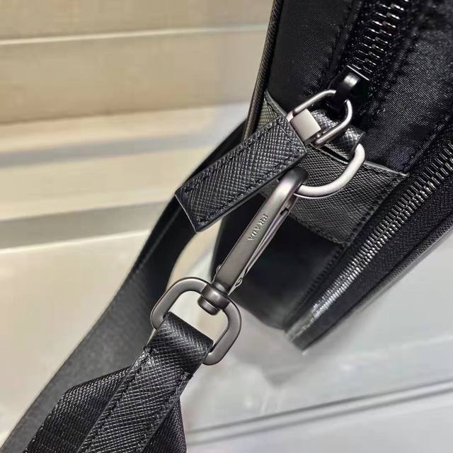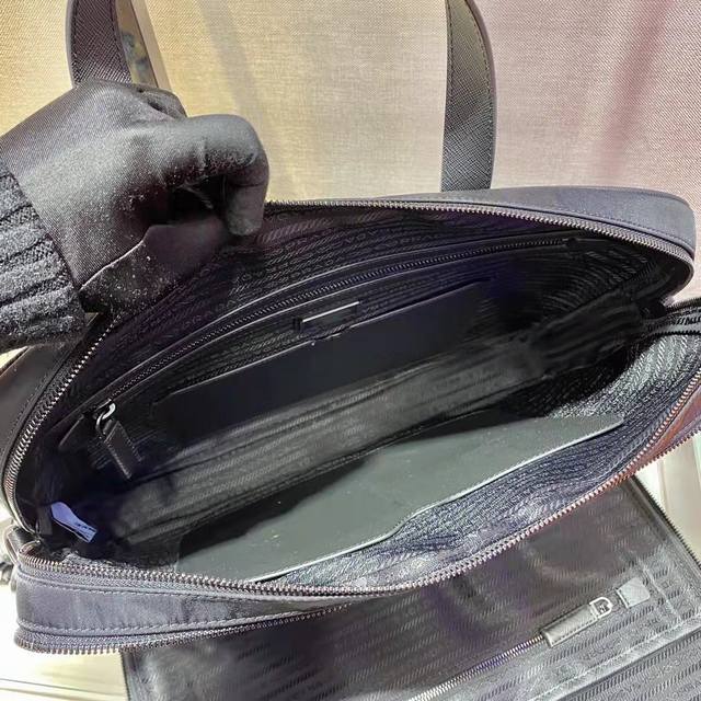 The new 2Ve005 briefcase from the Eco-Friendly Collection. This recycled nylon reinterprets the classic men's briefcase, adding a touch of class to the new season. It features double handles and a detachable shoulder strap. The signature recycled nylon logo accents create a striking and stylish design. For travel, attach it to your luggage. Extremely practical, this simple and unique design with a deep logo creates a stylish look. Hurry and get yours! Length: 38cm x Height: 28cm x Base: 6.5cm.