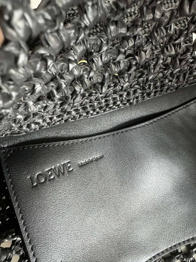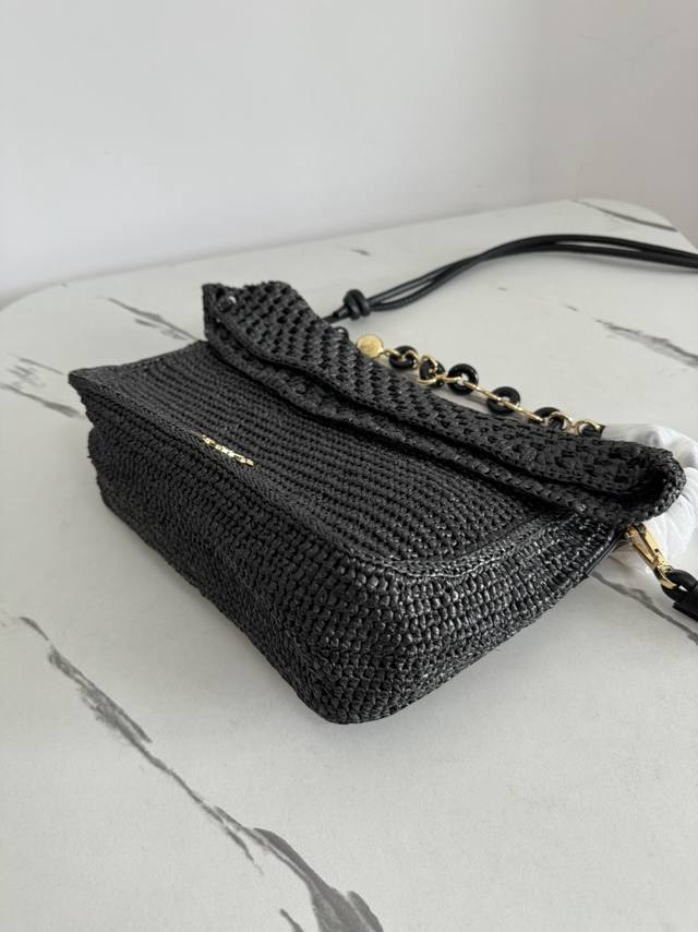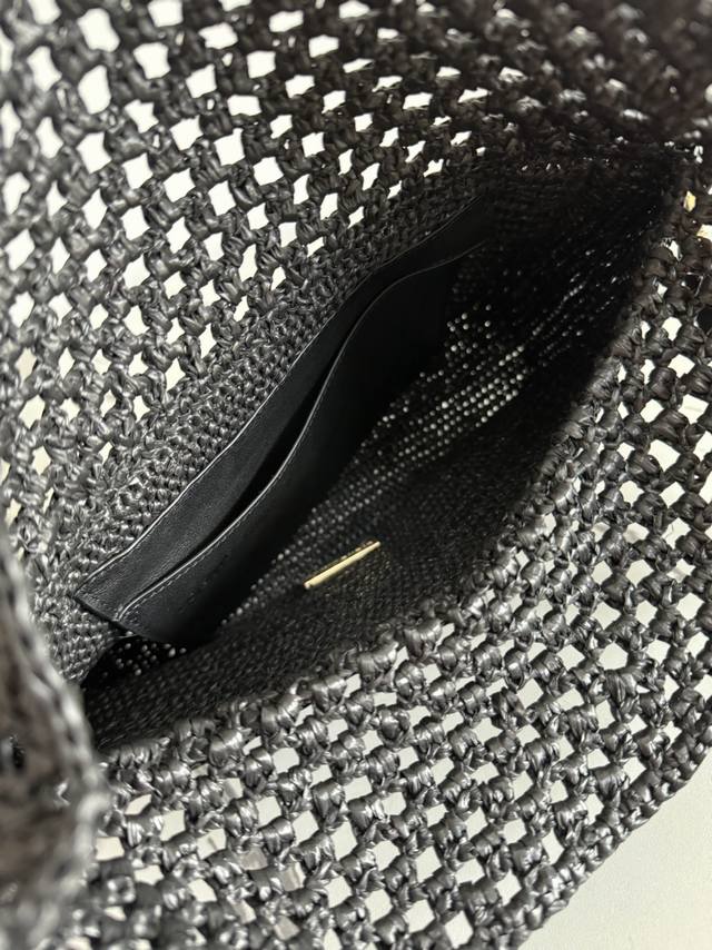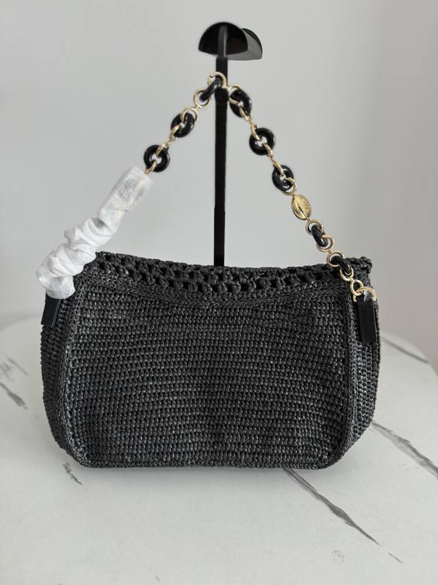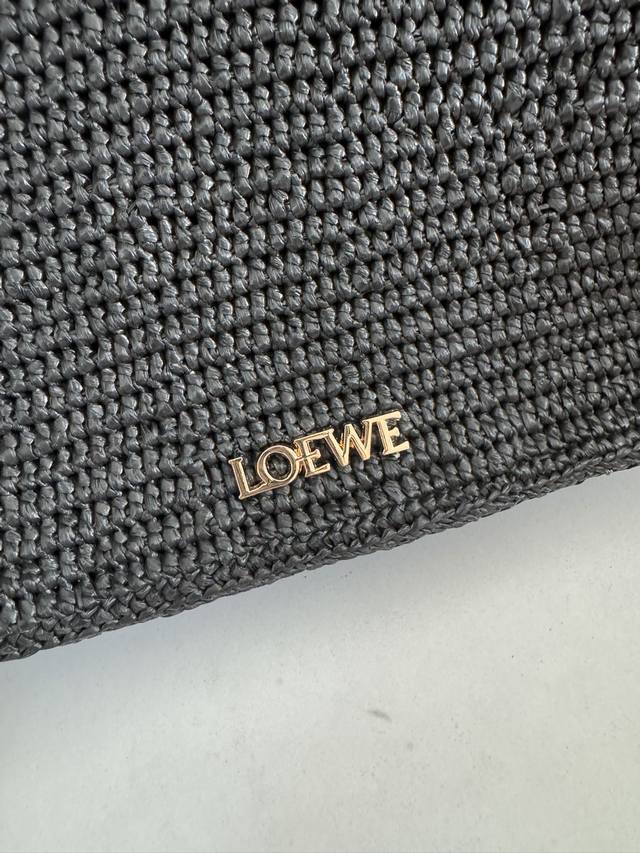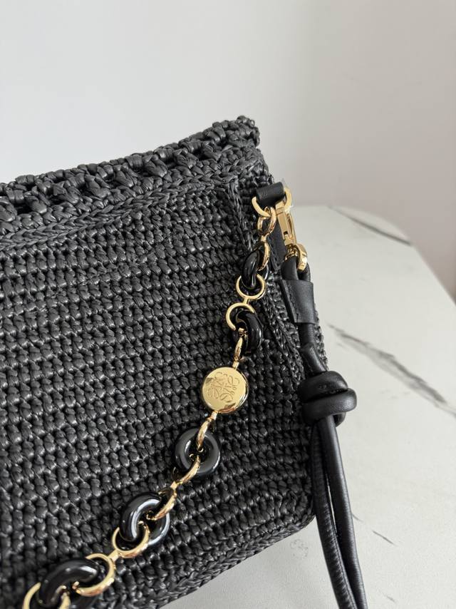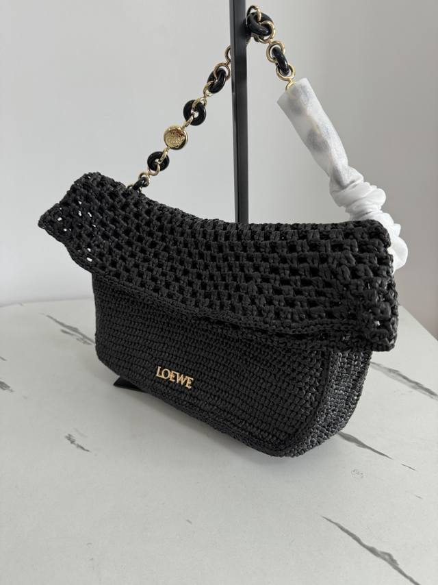 The Ola is a soft, lightweight, and versatile summer bag featuring a curved silhouette, a floating flap, and a bold donut chain. This medium style is crafted from raffia with calfskin details. Features include a detachable tubular calfskin shoulder strap, donut chain flap closure, and one interior pocket with an engraved Anagram metal Loe logo. Materials: Raffia, Calfskin,