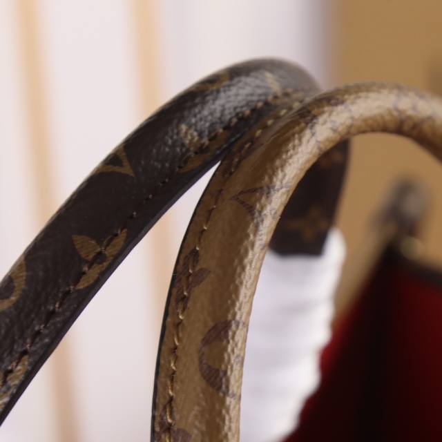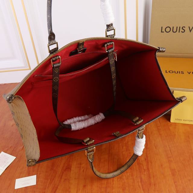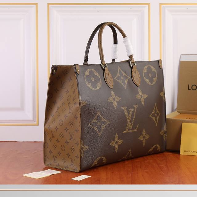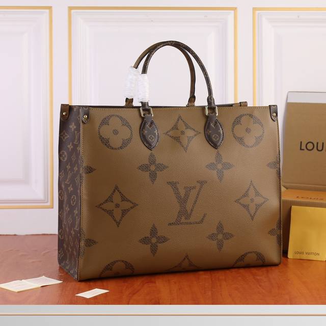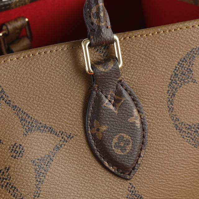 The Onthego handbag, featuring upgraded matching hardware, stands out against the backdrop of Monogram Giant canvas. The Monogram Reverse pattern is embellished on the sides and handles, creating a shift in color and texture within a similar style. The large size offers ample storage, and with a shoulder strap and Toron handles, it's easy to carry for everyday needs. Model: M44576 Dimensions: 41 x 34 x 19 cm (Length x Height x Width)