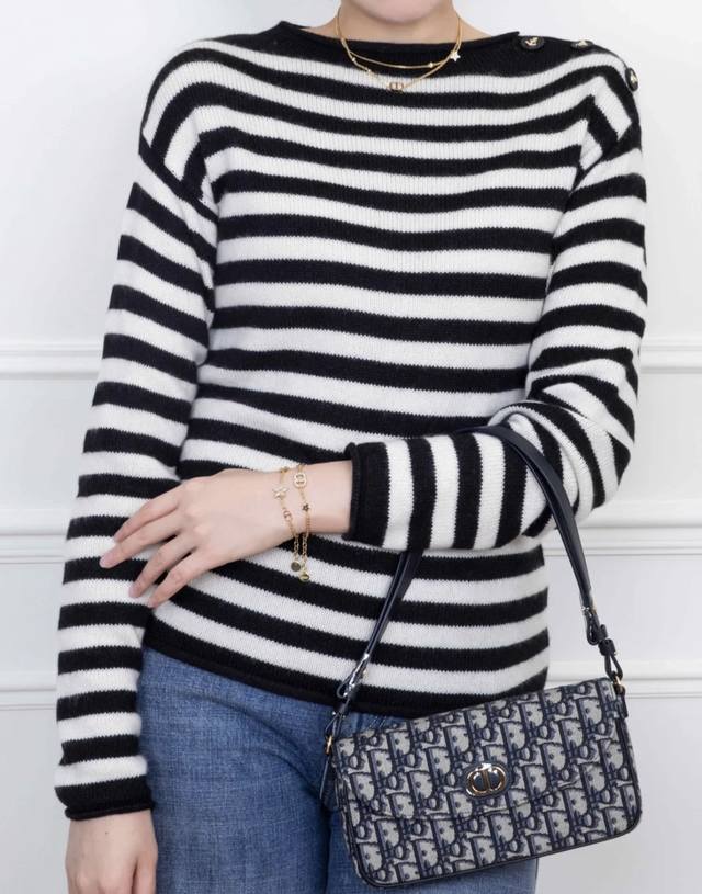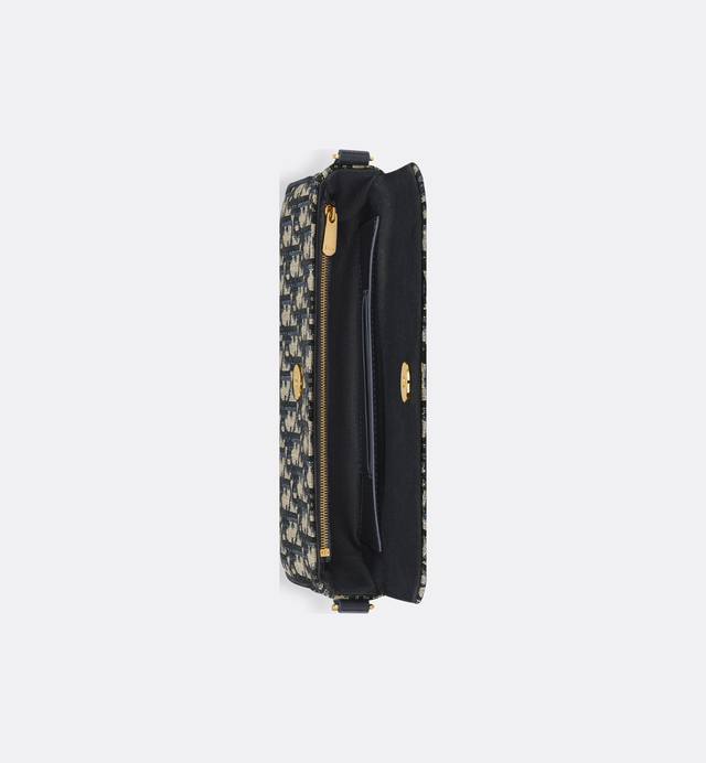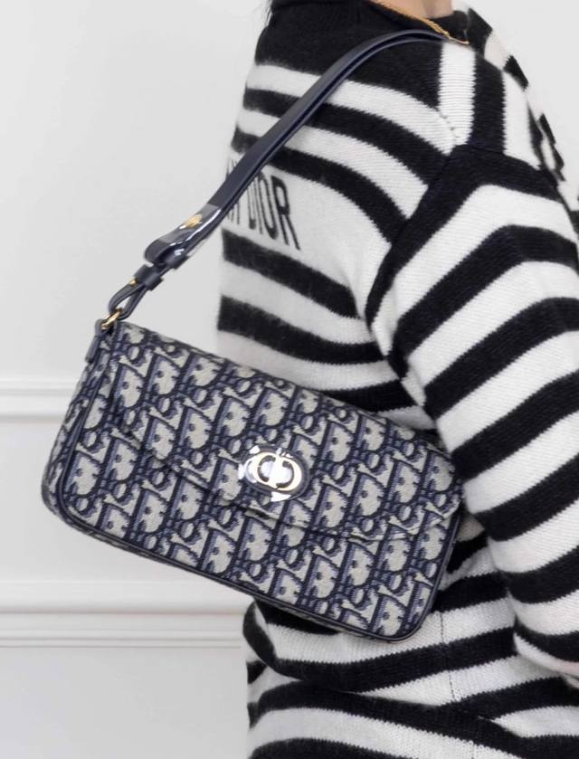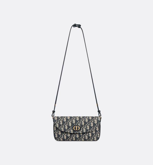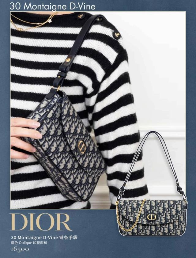 This 30 Montaigne D-Vine chain handbag is a new addition to the Fall/Winter 2025 collection. Practical and elegant, it's crafted from blue Oblique printed fabric and other materials. The half-moon flap is adorned with a gold-finished Cd logo and features a compartment for everyday essentials. It comes with a detachable and adjustable leather shoulder strap and a detachable chain, making it versatile enough to be easily carried over the shoulder or crossbody. Features include: an interior zip pocket, interior slip pockets, three card slots, an adjustable and detachable leather shoulder strap, and a chain shoulder strap with gold-finished metal links. Model: 4317. Dimensions: 22 x 12 x 5 cm (L x H x W). It can hold a mobile phone, a card holder, and a lipstick.