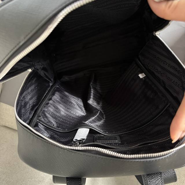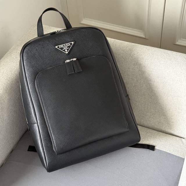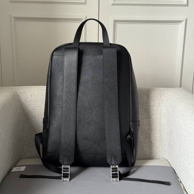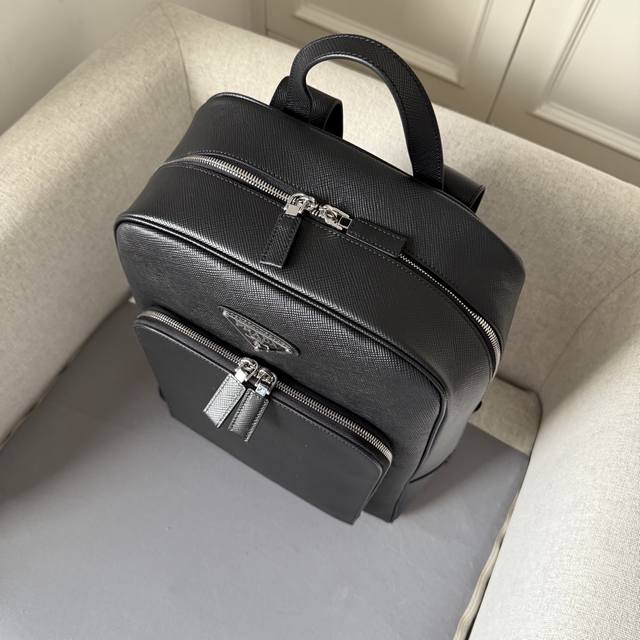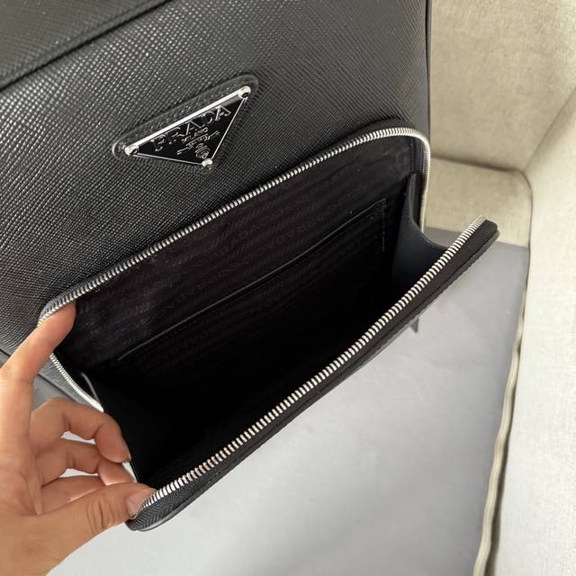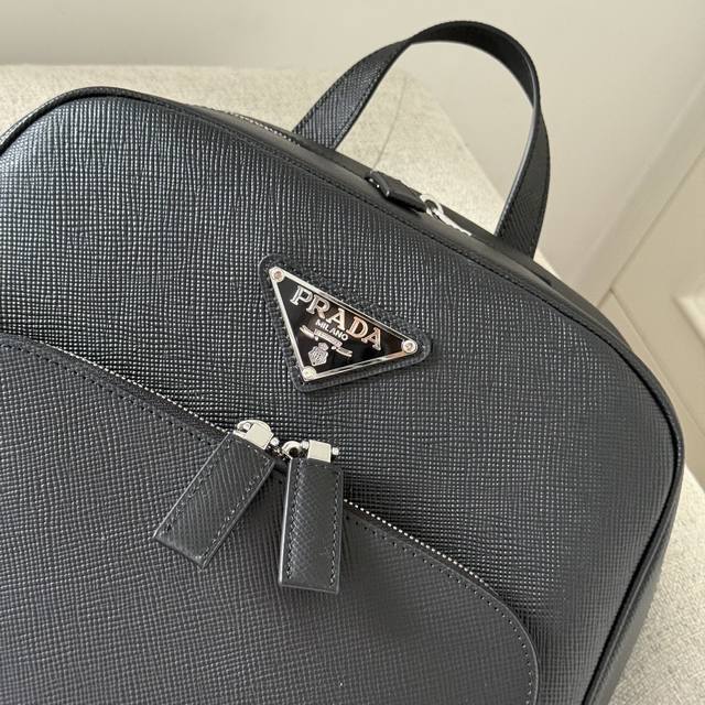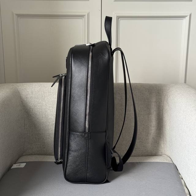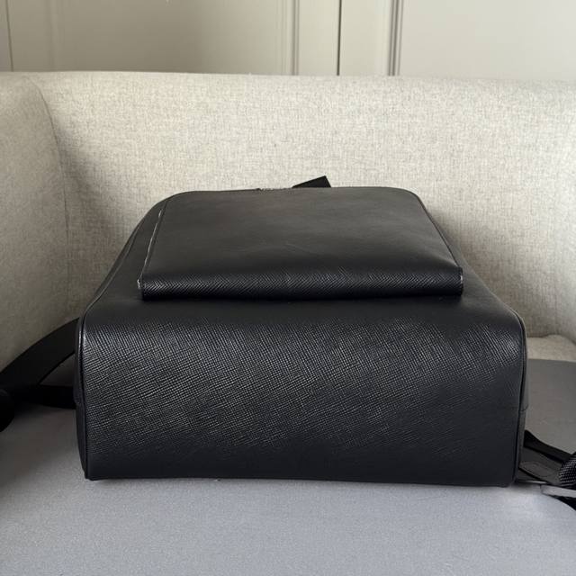 This Safano calfskin mini backpack embodies a minimalist design. It features a wraparound zipper and adjustable shoulder straps, adorned with an enamel-coated metal triangle logo for a signature touch. Features include: flat calfskin handles, adjustable webbing and shoulder straps, enamel-coated metal triangle logo on the front, zipper closure, dimensions 30-42-12 mm, model number 2Vz102, one external zippered pocket, and interior zippered pocket and slip pocket.