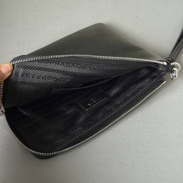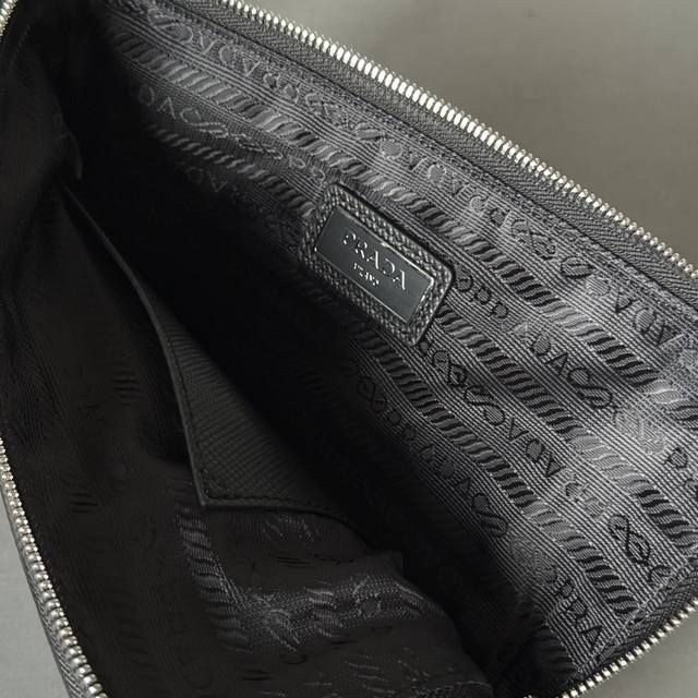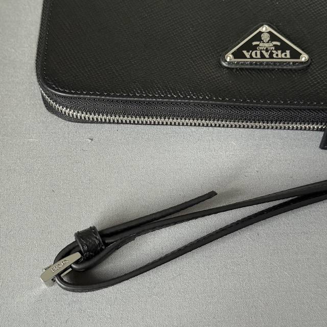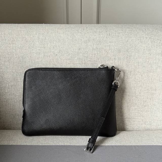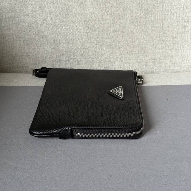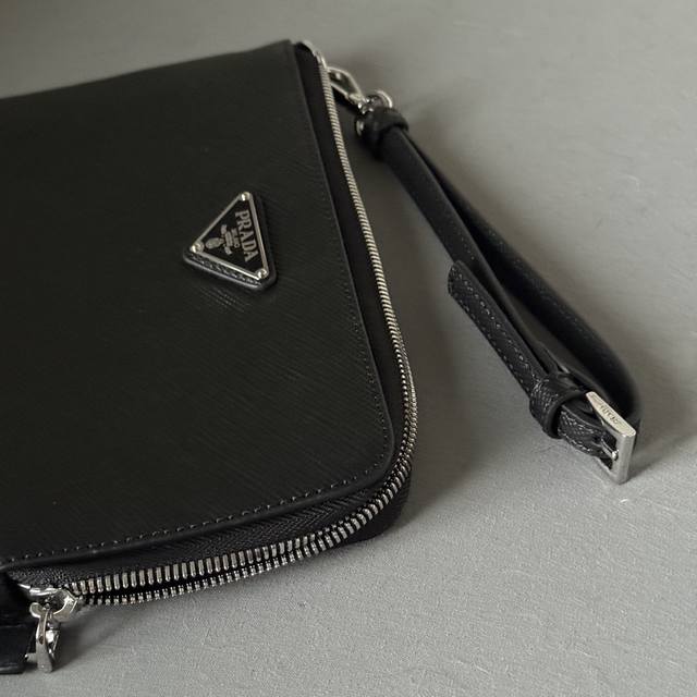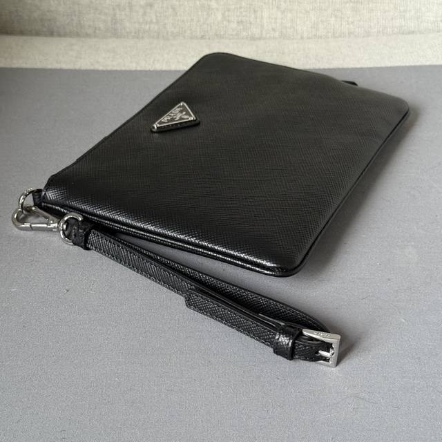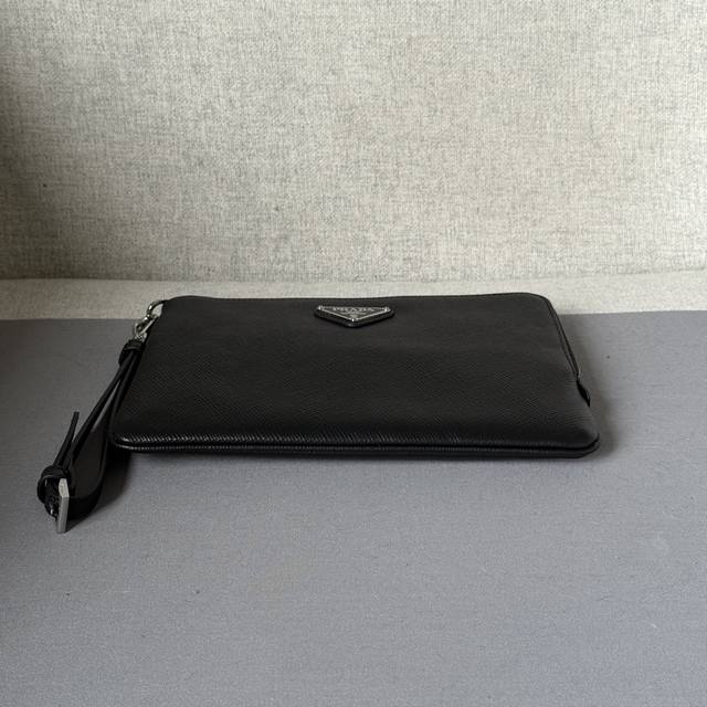 This Saffano calfskin pouch features a simple yet sophisticated elegance and clean lines, and comes with a detachable wrist strap. This petite and minimalist accessory is lined with Re-Nylon and adorned with the iconic enamel triangular metal logo, showcasing the brand's classic style. Dimensions: 24-17-2 Model: 2Nh024 Features: Detachable wrist strap, enamel triangular metal logo , zip closure, interior patch pocket with lining.