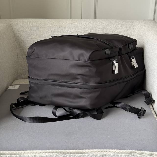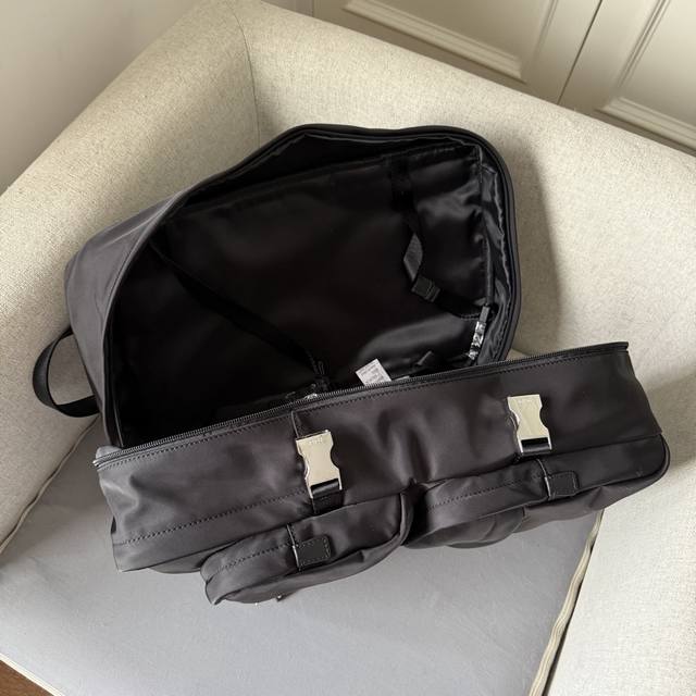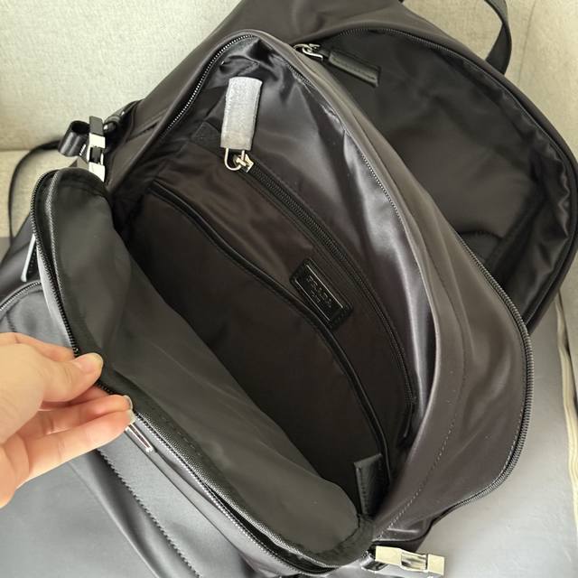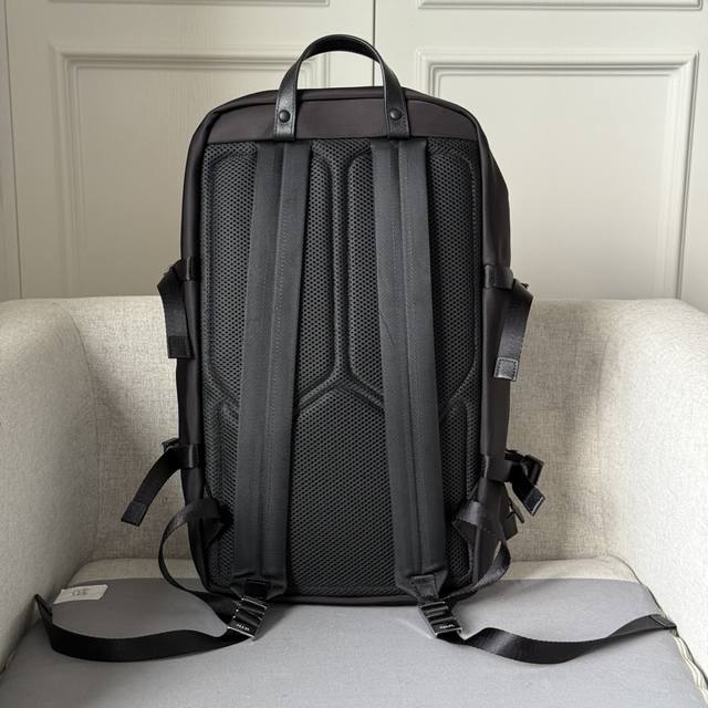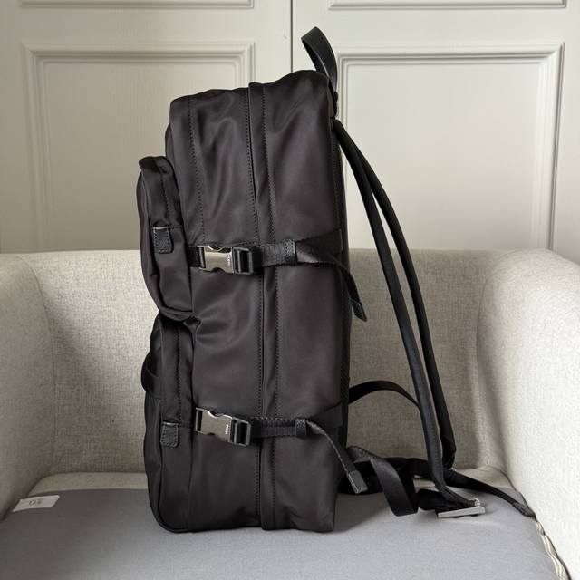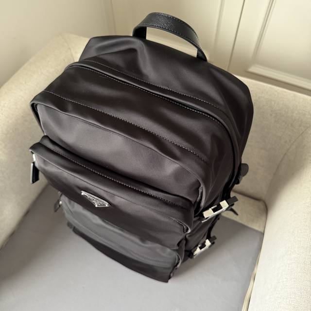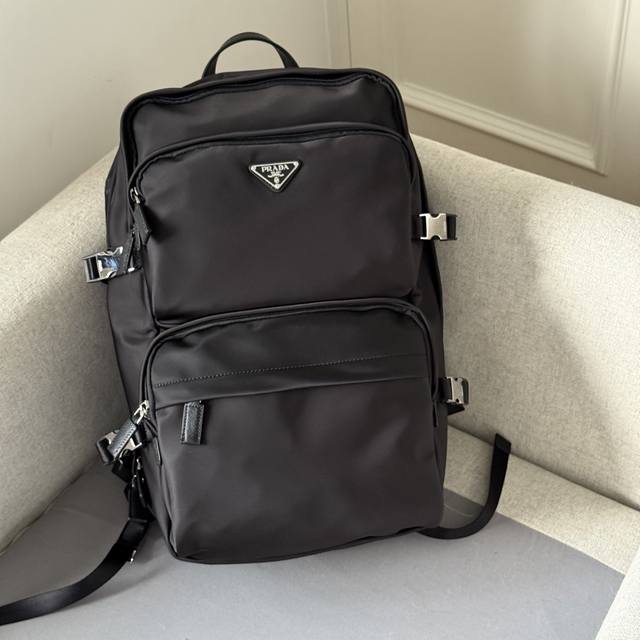 This spacious Re-Nylon backpack boasts a tech-inspired look. Made from recycled ocean plastic, the Re-Nylon embodies innovation. A zippered main compartment and snap closure allow for easy organization, while striking Saffano leather details add a touch of glamour. Prada's signature Saffano leather is synonymous with luxury and a symbol of traditional Italian leather craftsmanship. This high-quality calfskin features a cross-parallel grain and a waxed finish. Dimensions: 26.5-45-21.5 Model: 2Vz101 Features: Two compartments, leather handles, adjustable padded nylon shoulder straps, enamel metal triangle logo on the front, zip closure, three external zippered pockets, padded mesh back, interior zippered pocket, patch pocket, leather drawstring and snap closure, Re-Nylon padded lining, side closures and drawstrings.