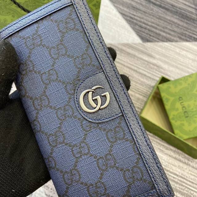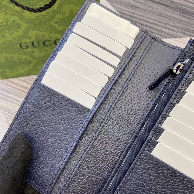 Top-of-the-line new Ophidia series Gg long wallet. This new series presents slim and compact leather goods, meticulously crafted with a signature color scheme that perfectly showcases the classic Gg logo. This long wallet features multiple card compartments and pockets, presented in a sophisticated blue finish, accented with silver double-G hardware for a complete and polished look. Dimensions: 19 x 10 x 2 cm. Model: 791746. Dimensions: 19 cm long x 10 cm wide x 2 cm thick. Color: Blue PVC.