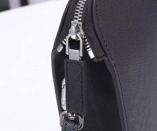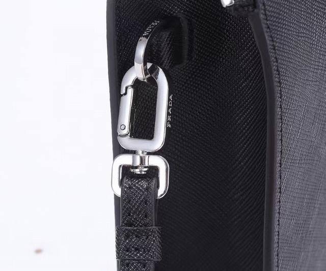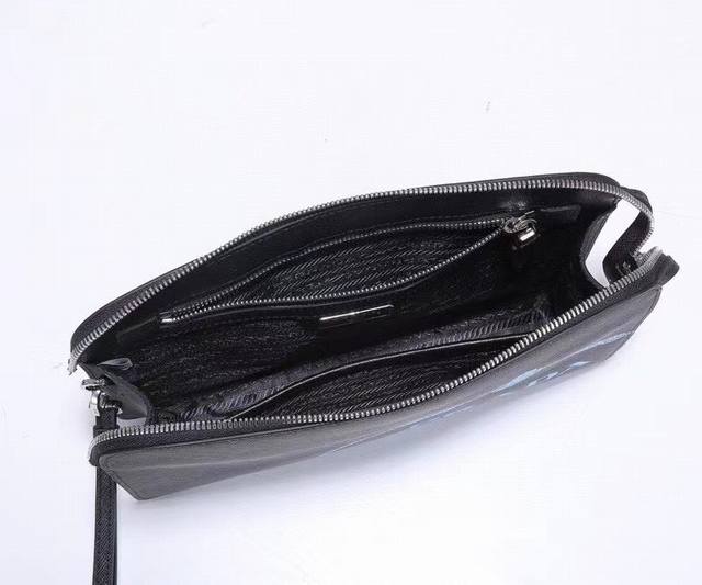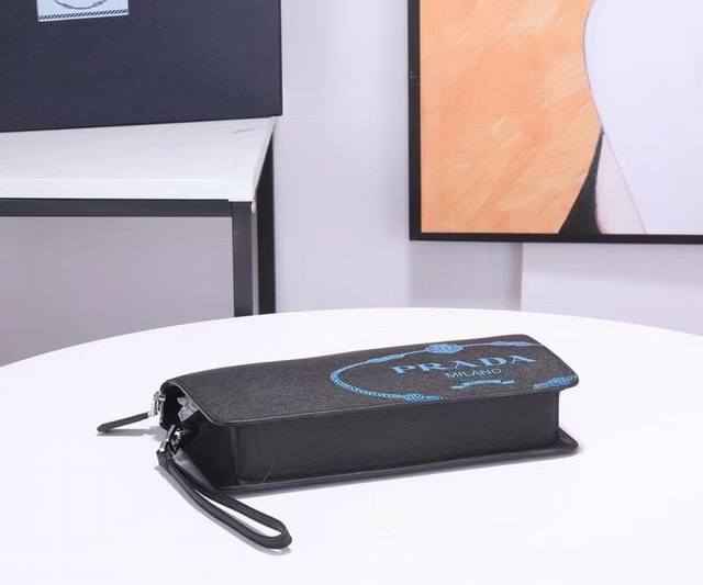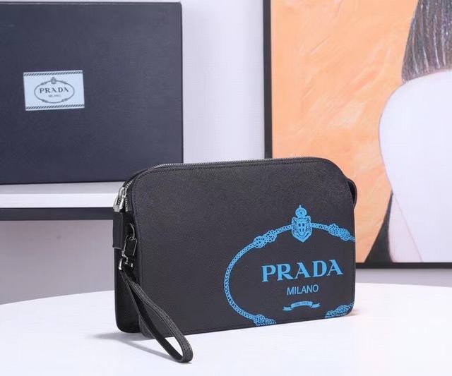 With Original Box Saffiano Leather Men's New Style Clutch Bag Counter Synchronization 2Vf056 Embossed Silk Screen Detachable Wrist Strap Brushed Polished Steel Accessories Front Embossed Microphone Logo Imported Cross Grain Cowhide With Nylon Lining 6 Card Slots Length 27Cmx Height 17Cmx Width 5Cm