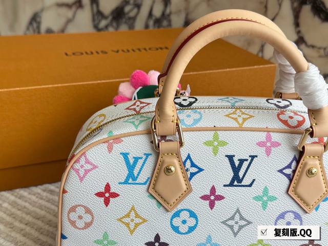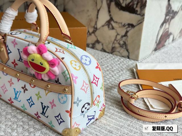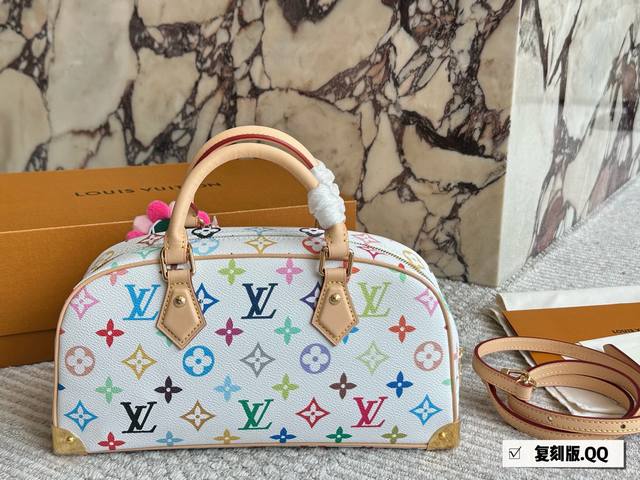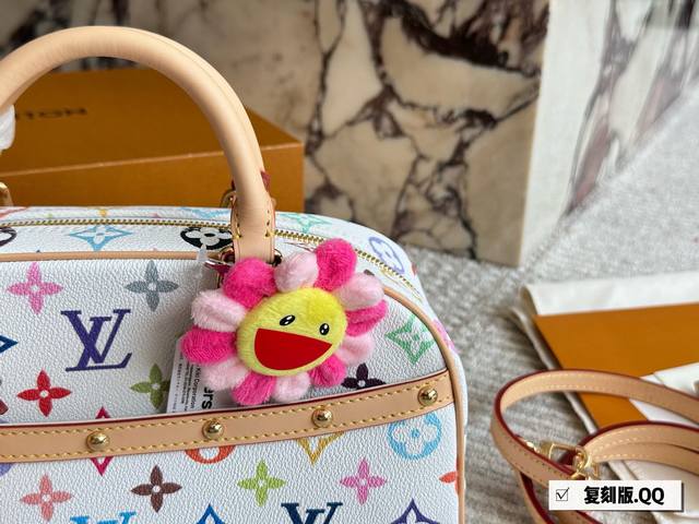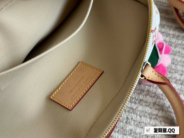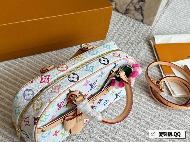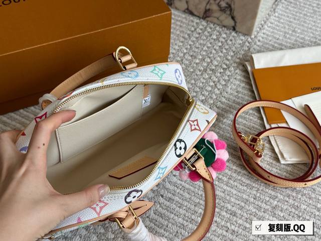 Box included DDD Size: 27*19Cm DDD L's Takashi Murakami bowling bag! This time, the white tricolor bag is my favorite. It's so beautiful in person!# DDD It has a whole retro millennium feel to it. The interior is also quite spacious. DDD It looks good when carried by hand, not old-fashioned at all, and is especially cute. DDD Put it away.