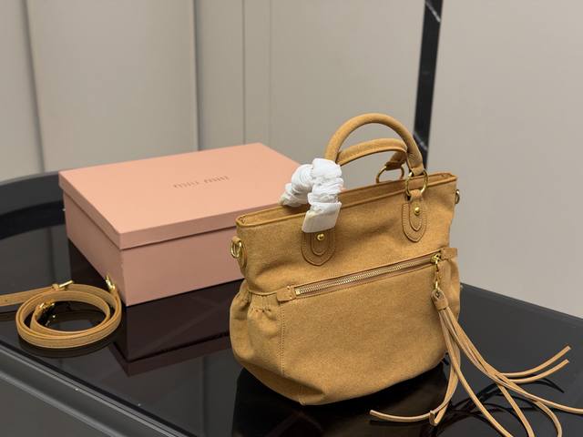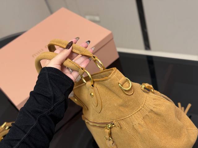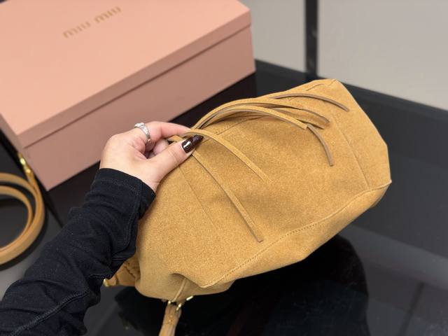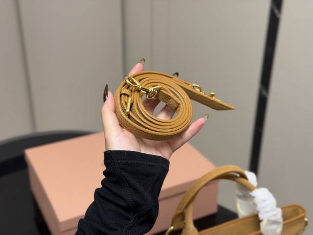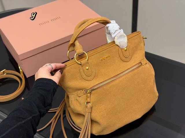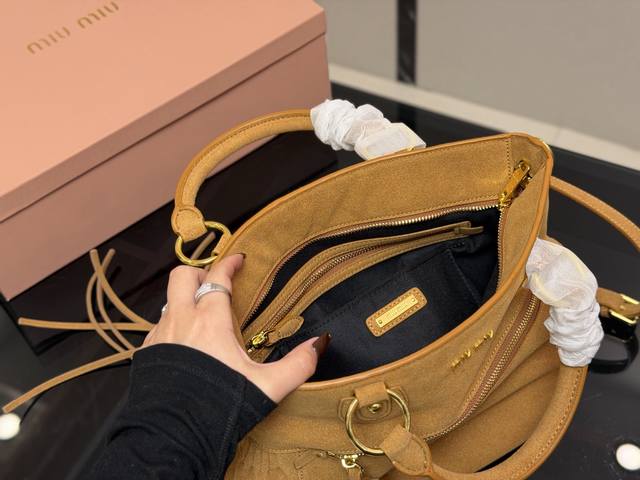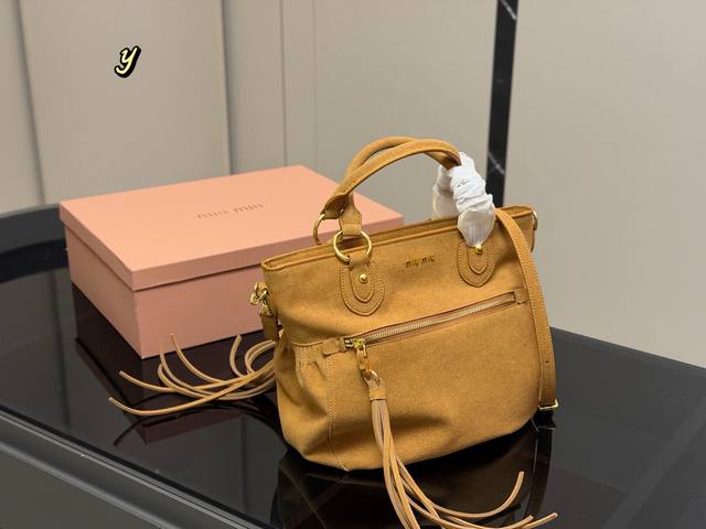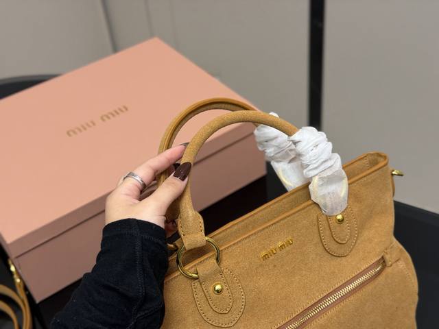 Comes with a box. The quality of this Miu Miu bag is amazing! It's a very unique Miu Miu bag with a futuristic vibe. You don't have to worry about bumping into someone with the same designer bag. The overall soft suede color is versatile; you can wear it however you like. It has both a handle and a long shoulder strap. Size: 26.27cm.