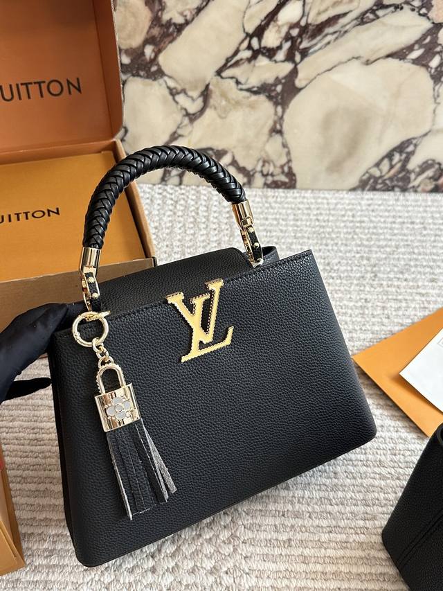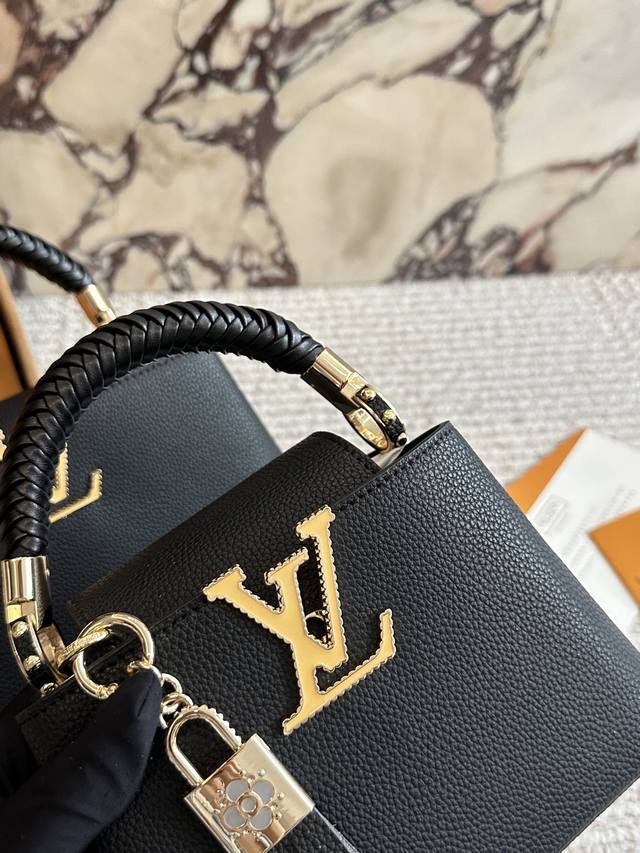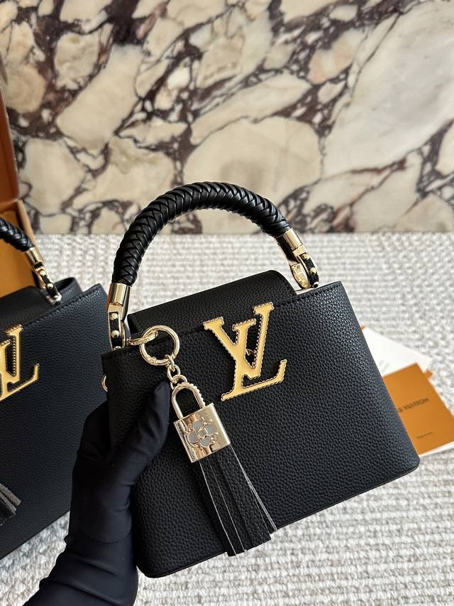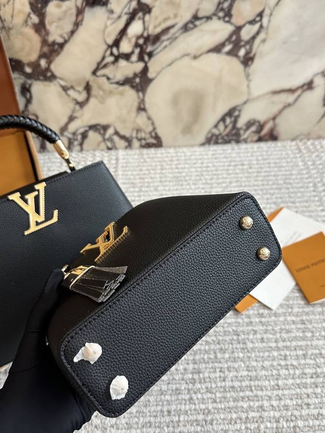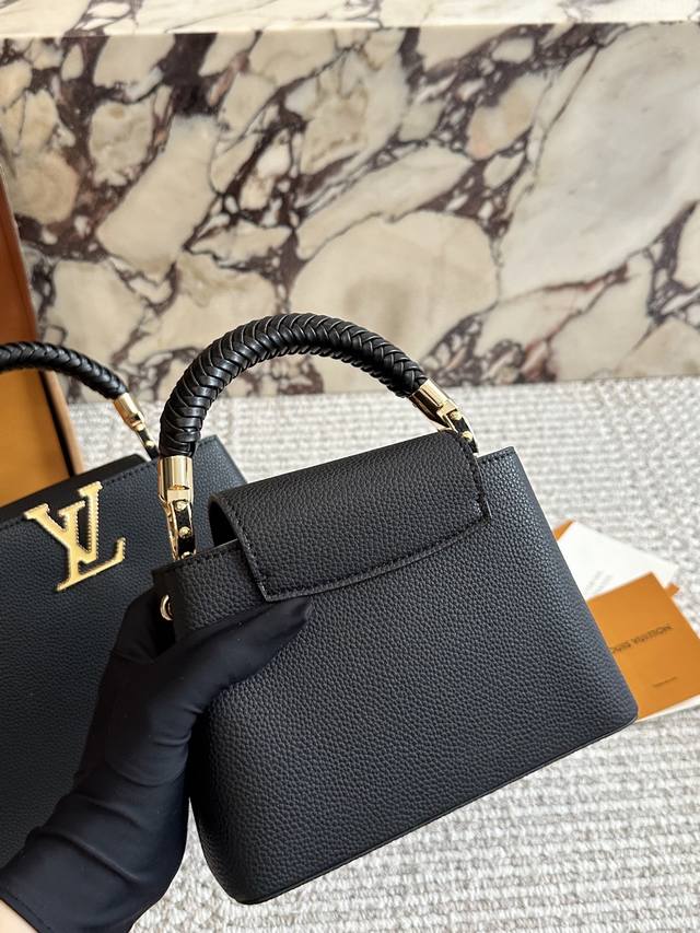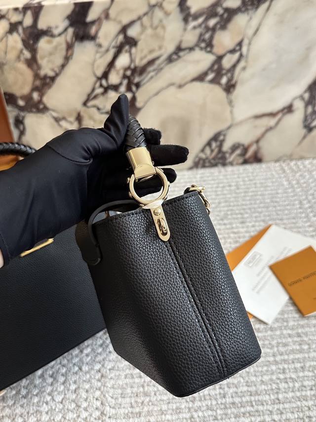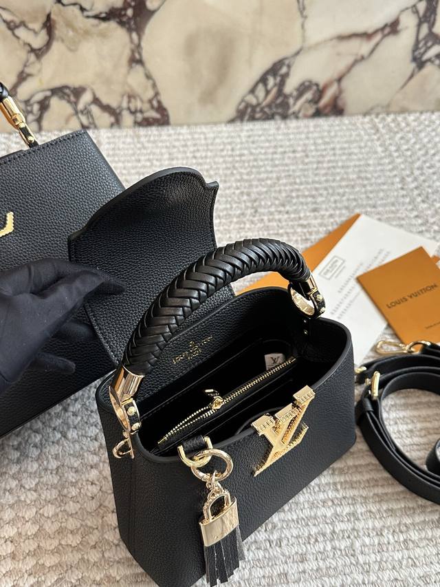 Folding Box DDD Capucines luxury handbag with gold-plated hardware, featuring an extremely intricate manufacturing process, a must-have for a queenly style. The Mini version boasts a unique extra-wide shoulder strap, a classic large logo design, and simple yet elegant Monogram floral elements. The size is reasonable, with adequate capacity. It can be carried by hand or over the shoulder. Classic size: Large 28cm, Small 20cm. DDD