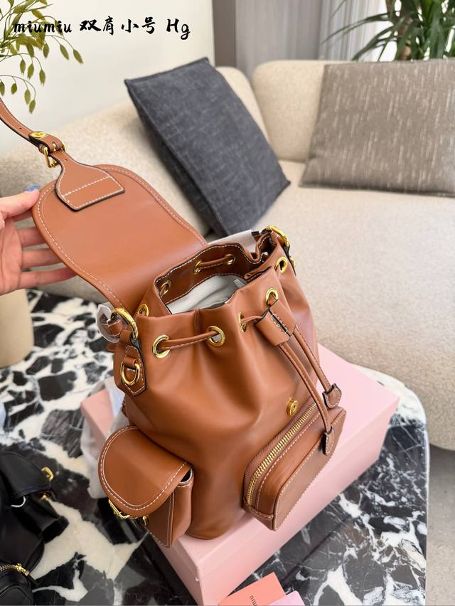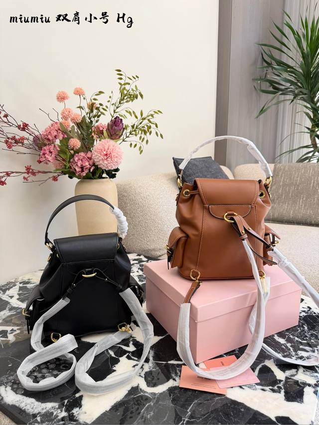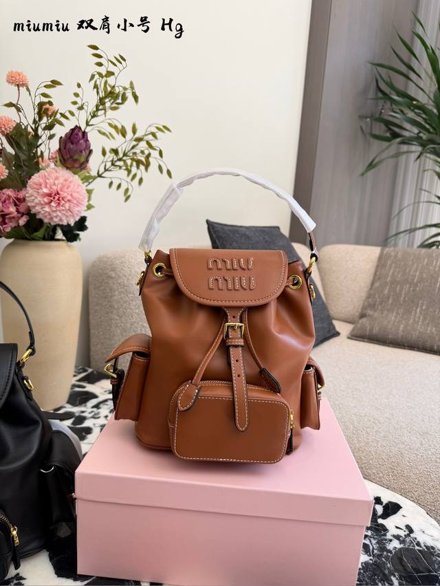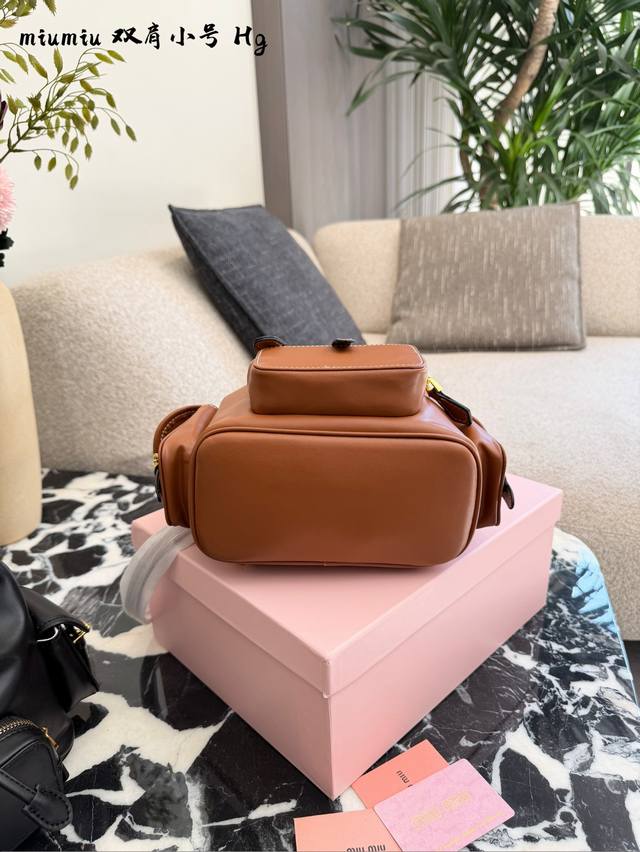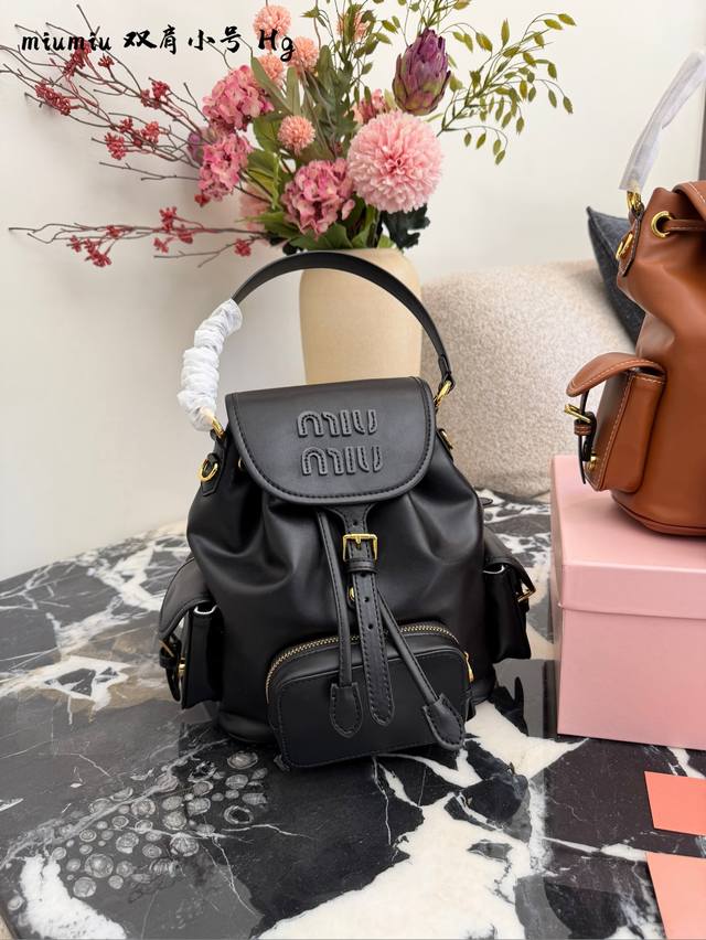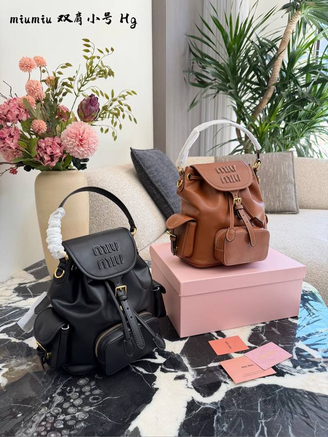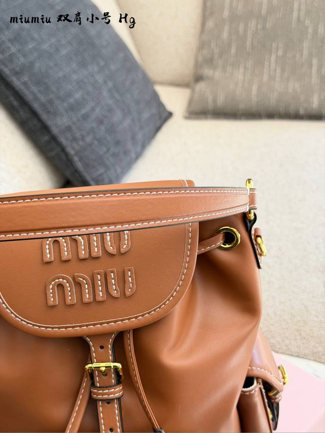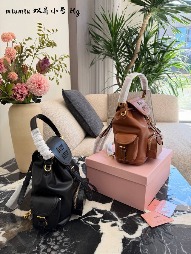 ) This is a Miu Miu backpack made of cowhide leather with a smooth and textured surface. The front of the bag features the brand's iconic "Miu Miu" logo. This classic design is suitable for everyday use or pairing with fashionable outfits. It is not only durable but also has some collectible value. (