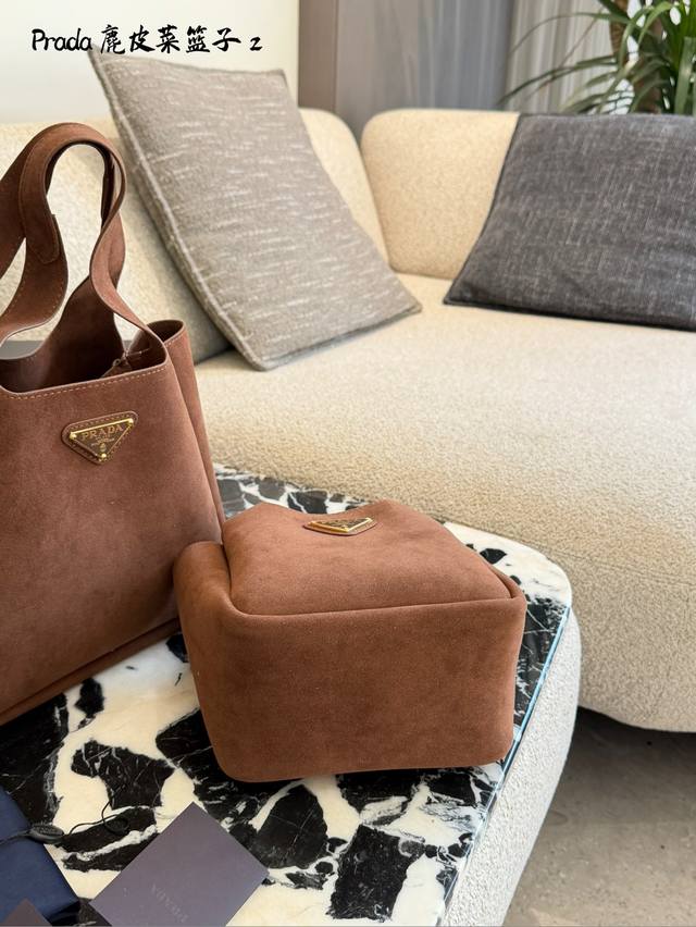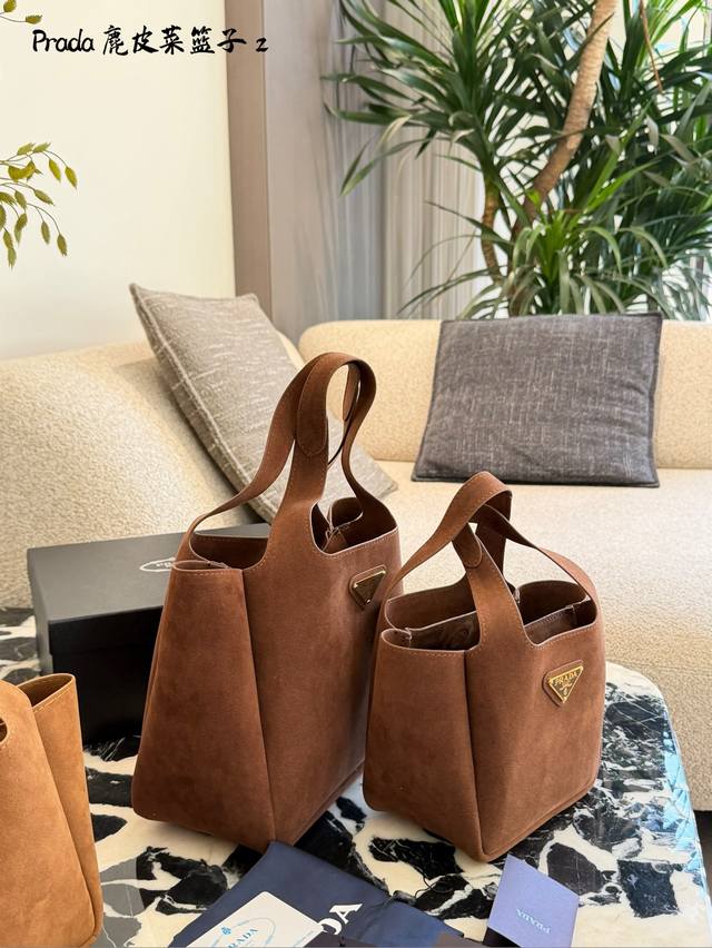 Prada Basket Bucket Bag, Autumn/Winter Suede Handbag. Made entirely of leather inside and out, this suede bucket bag features double handles adorned with a metal logo. The bag is exceptionally soft and lightweight, exuding an elegant and outstanding style. Two side pockets provide both refined storage and a touch of sophistication. It can be carried by hand or worn as a shoulder bag! A handbag that perfectly blends classic heritage with contemporary trends! Dimensions: 15.5