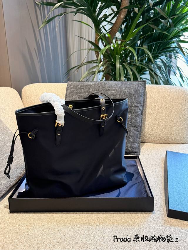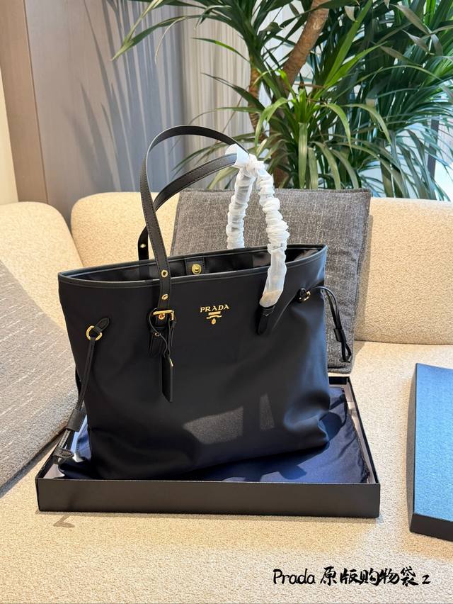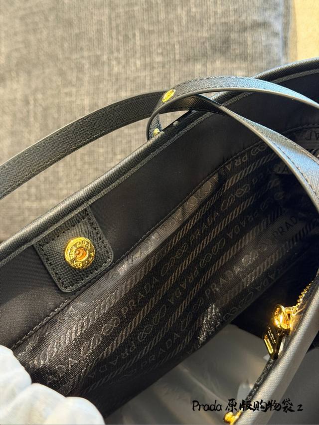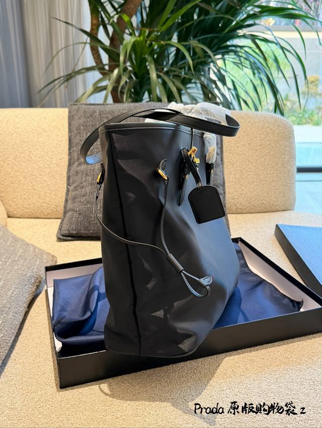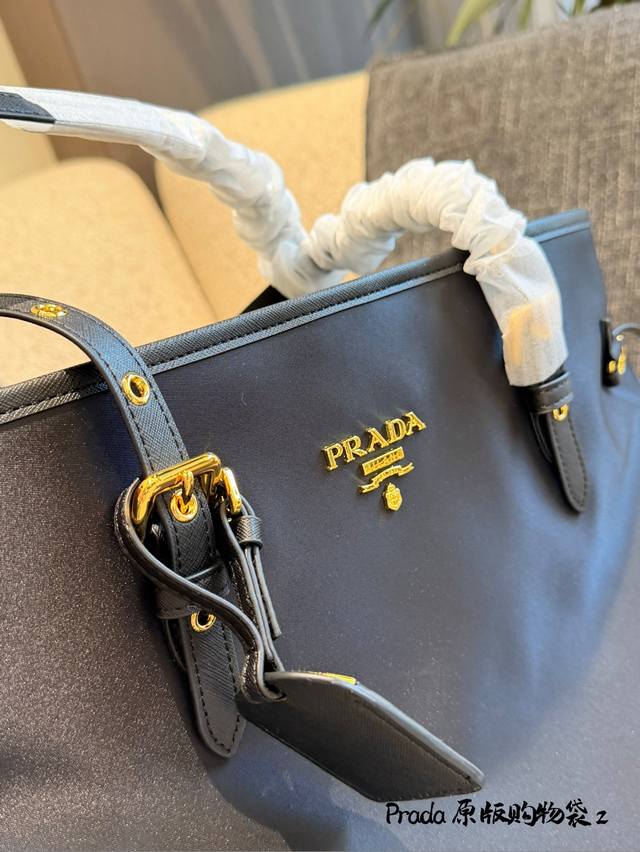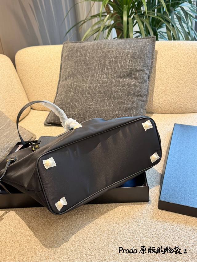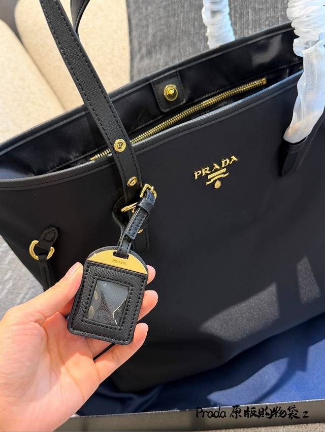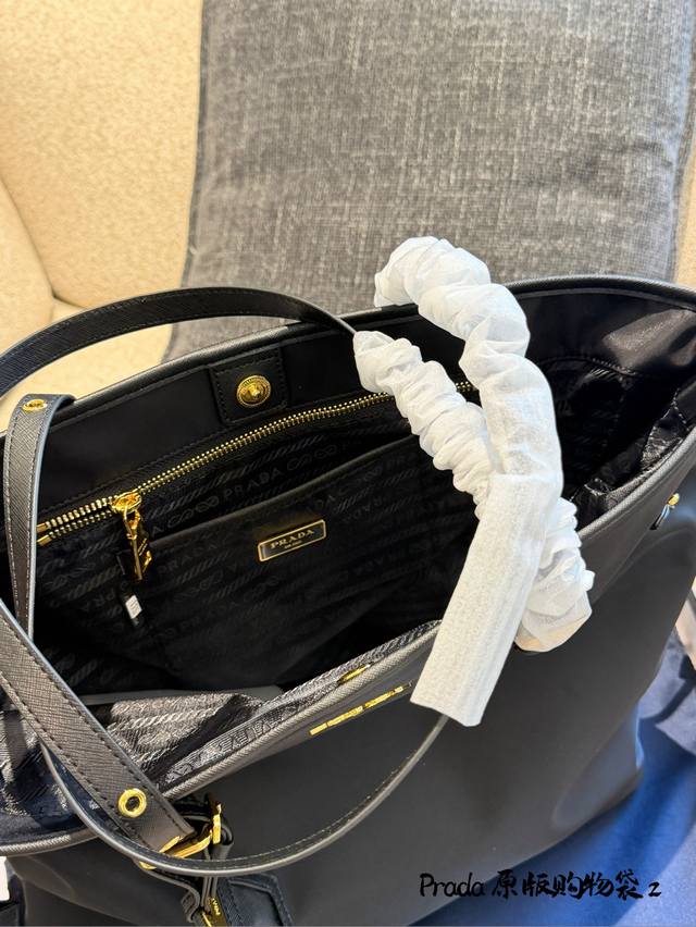Prada Black and Gold Nylon Tote Bag DDD This Prada black and gold nylon tote bag features classic parachute nylon with black leather trim. It's simple, elegant, lightweight, and durable. The triangular metal logo on the front is highly recognizable. It has a large capacity, making it suitable for commuting or short trips. DDD