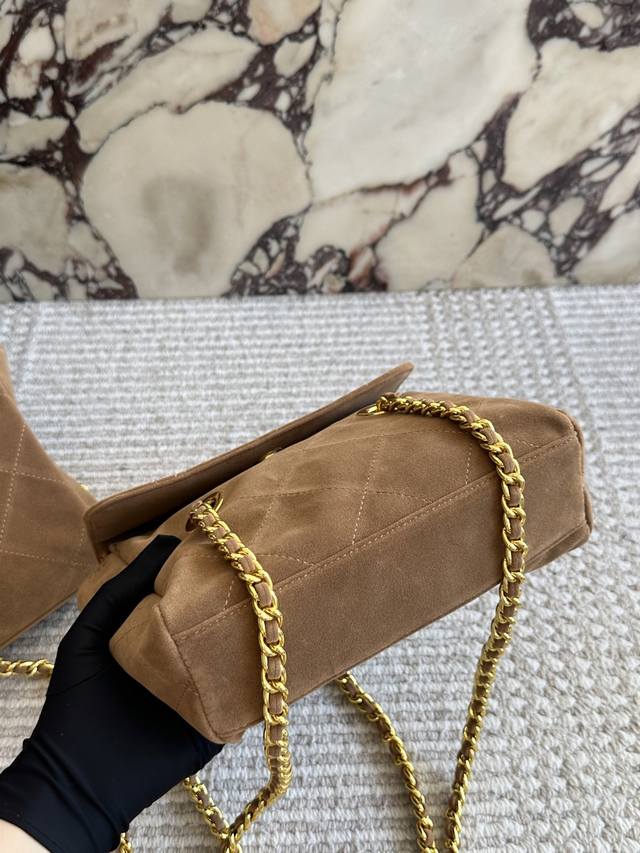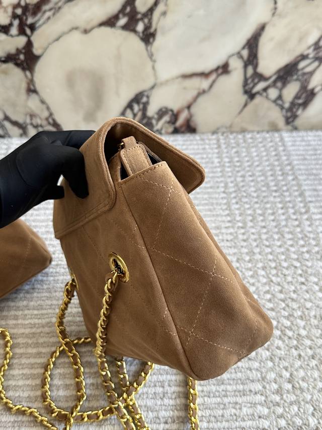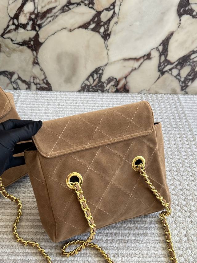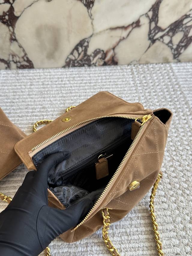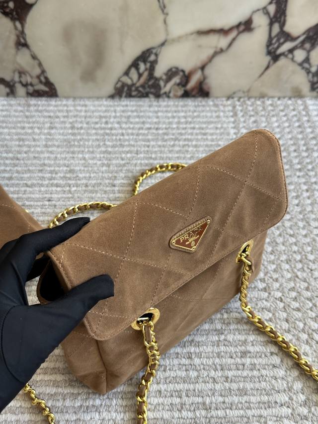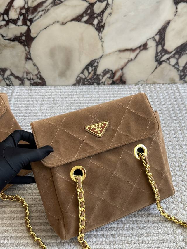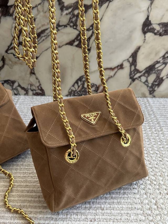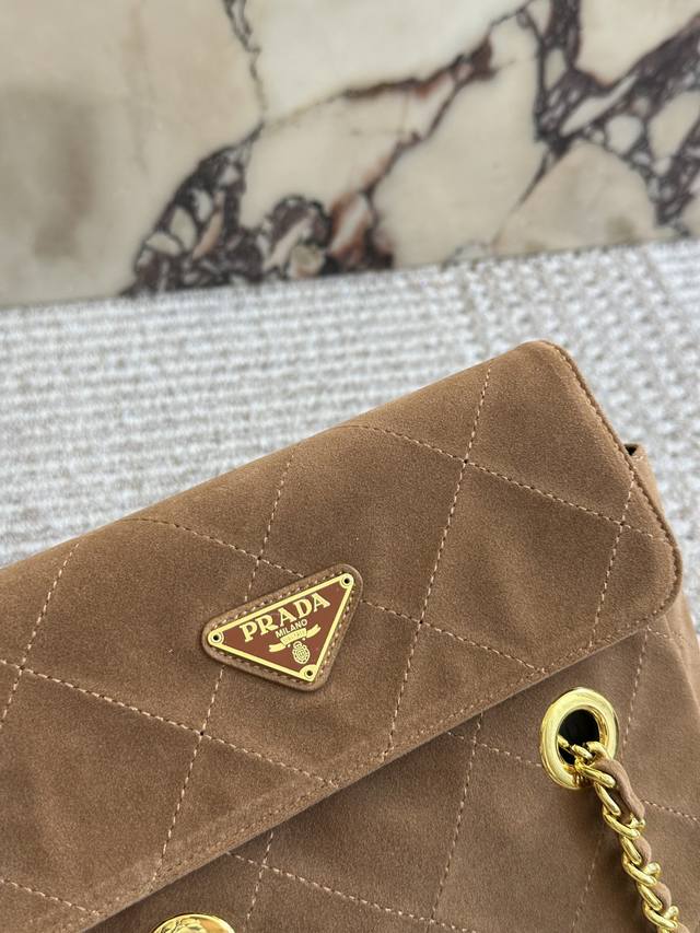 Prada Suede Parachute Bag DDD This Prada classic parachute series suede bag features golden-brown suede with a diamond quilting pattern. The texture is soft and delicate, exuding understated elegance. It has a drawstring closure and a flap design, paired with a metal triangle logo for high brand recognition. 22cm 26cm DDD