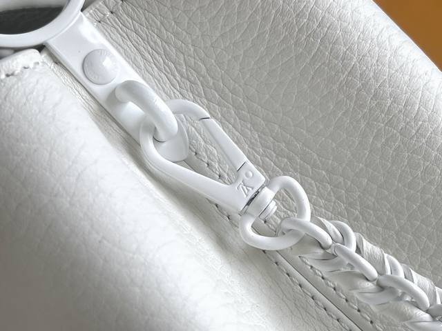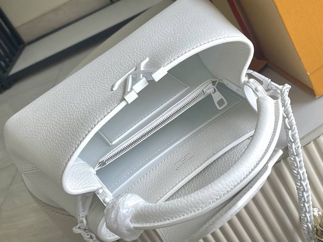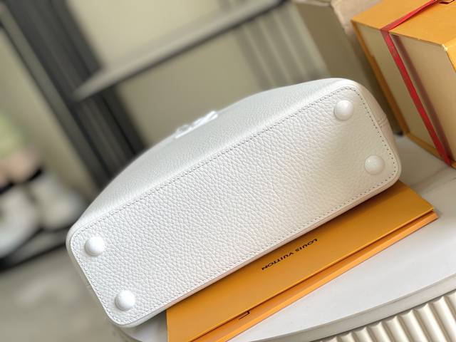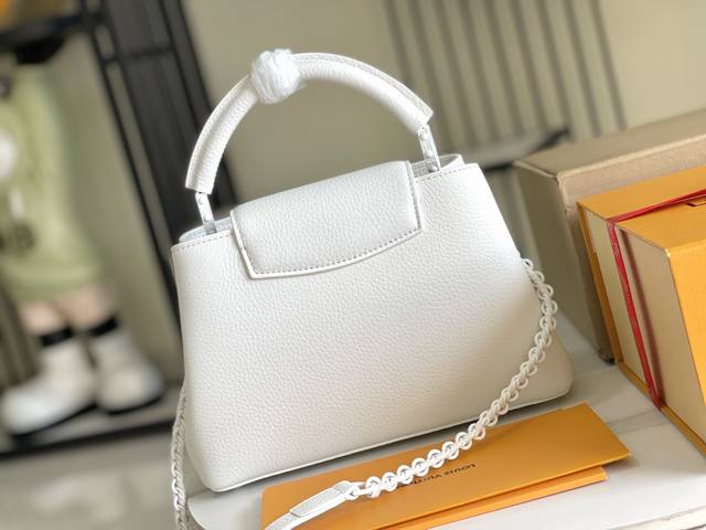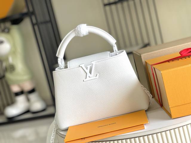 163 Chip, Premium Quality, Full Packaging, Premium Genuine Leather M25255. This season, the small white Capucines BB handbag tells a new Capucines story. The delicate metallic Monogram floral band elevates this classic handbag with a more feminine touch. The refined white body, accented with a gold crown, exudes elegance and practicality. Details: 27.0 x 18.0 x 9.0 cm.