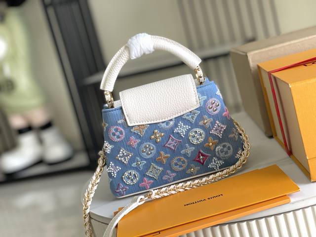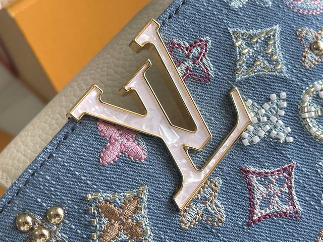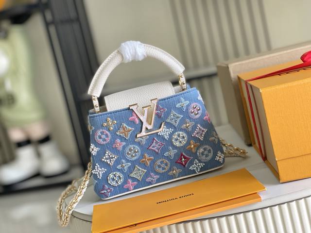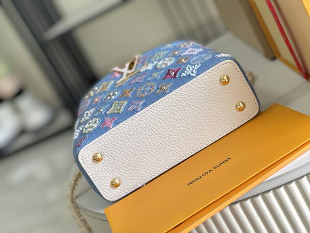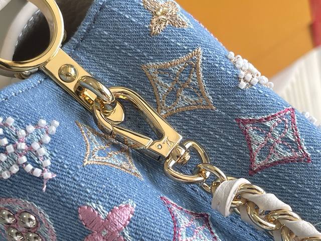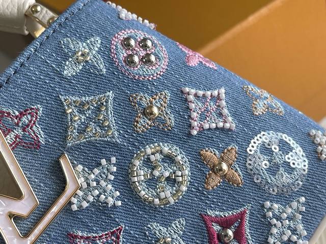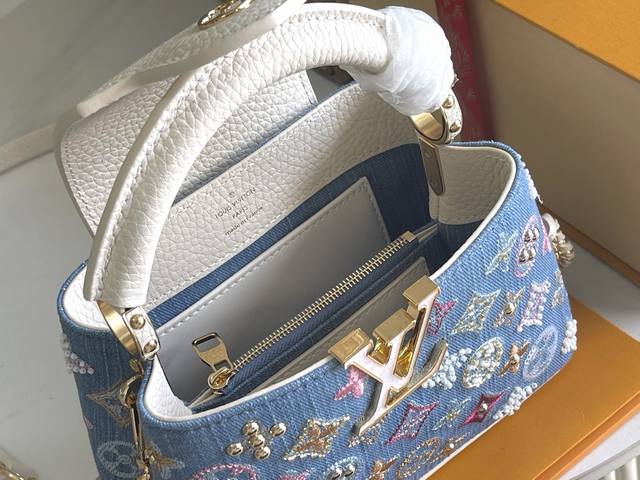 Capucines BB Handbag This season, the Capucines story is reimagined. The delicate metallic Monogram floral band elevates this classic handbag with a more feminine touch. The refined white body, accented with a gold crown, exudes elegance and practicality.