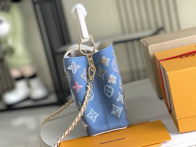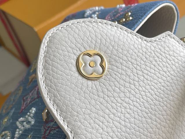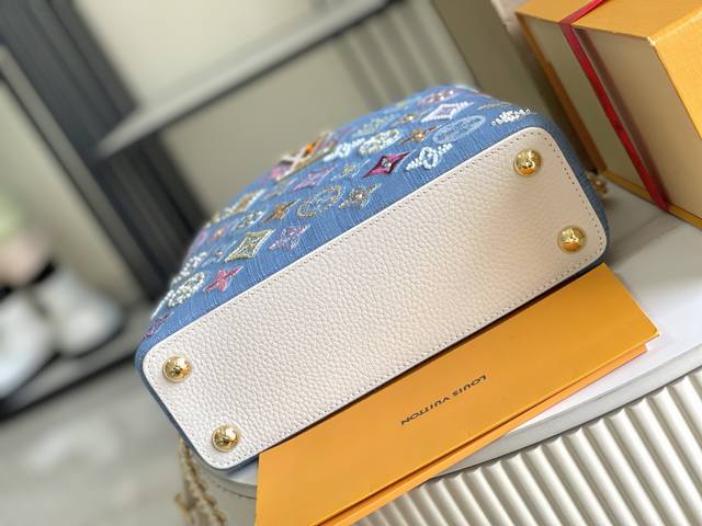 163 Premium Chip with Full Packaging. Premium Genuine Leather M12947 Denim Small. This season, the Capucines BB handbag tells a new Capucines story. The exquisite metallic Monogram floral band adds a feminine touch to this classic handbag. The refined white body, accented with a gold crown, exudes elegance and practicality. Details: 27.0 x 18.0 x 9.0 cm.
