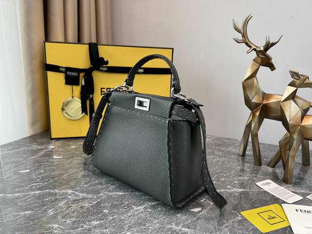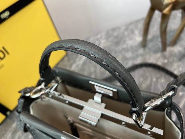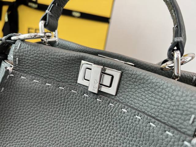 244 Small handbag with two compartments, separated by a hardboard. Twist locks on both sides. Lined interior with zipper pocket. Single handle and adjustable, detachable crossbody strap. Made of black Romano leather. Brown Romano leather-lined compartments. Palladium-plated metal finish. Dimensions: 23*18*11