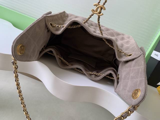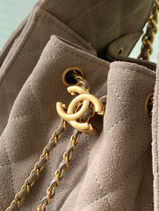 25K Bag, Suede Leather, Vintage Gold Coin Button Drawstring Bucket Bag with Quilted Pattern, Classic Chain Design, Exuding Sophistication! A must-have for everyday outings, exquisite appearance, delicate texture, easily complementing both casual and formal occasions. Style Number As5293, Size 30-26-14.