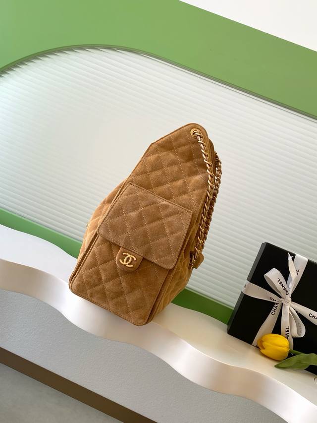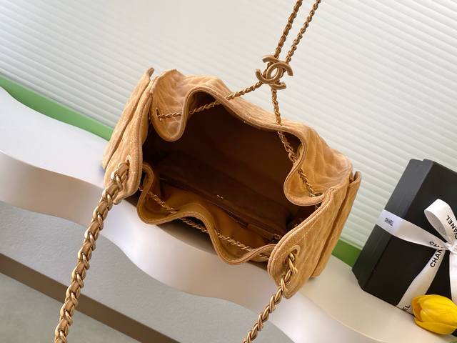 26C Bag, Suede Leather, Vintage Gold Coin Button Drawstring Bucket Bag with Quilted Pattern, Classic Chain Design, Exuding Sophistication! A must-have for everyday outings, exquisite appearance, delicate texture, easily adaptable to both casual and formal occasions. Style Number As5311, Size 30-40-15.