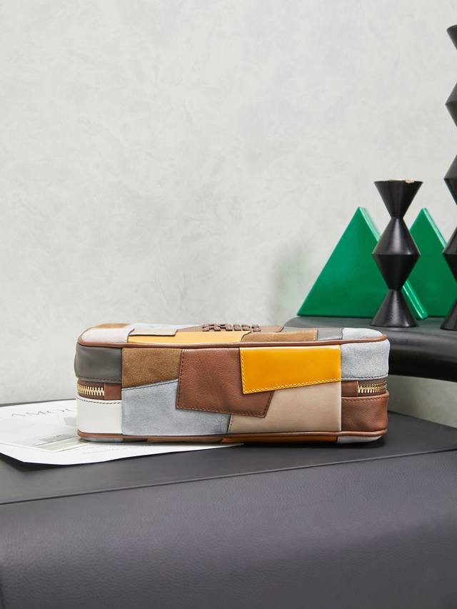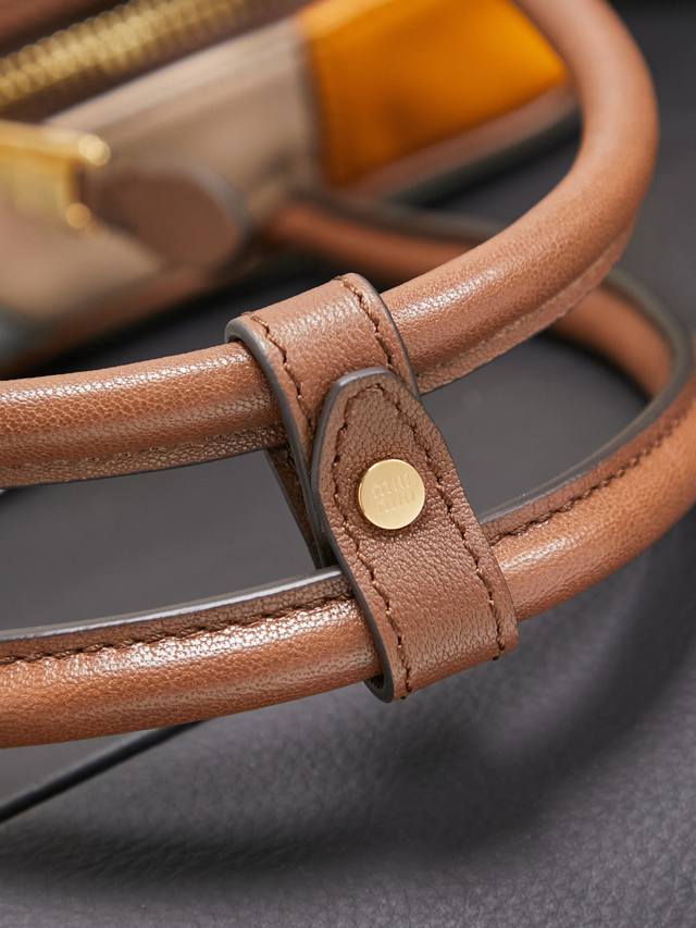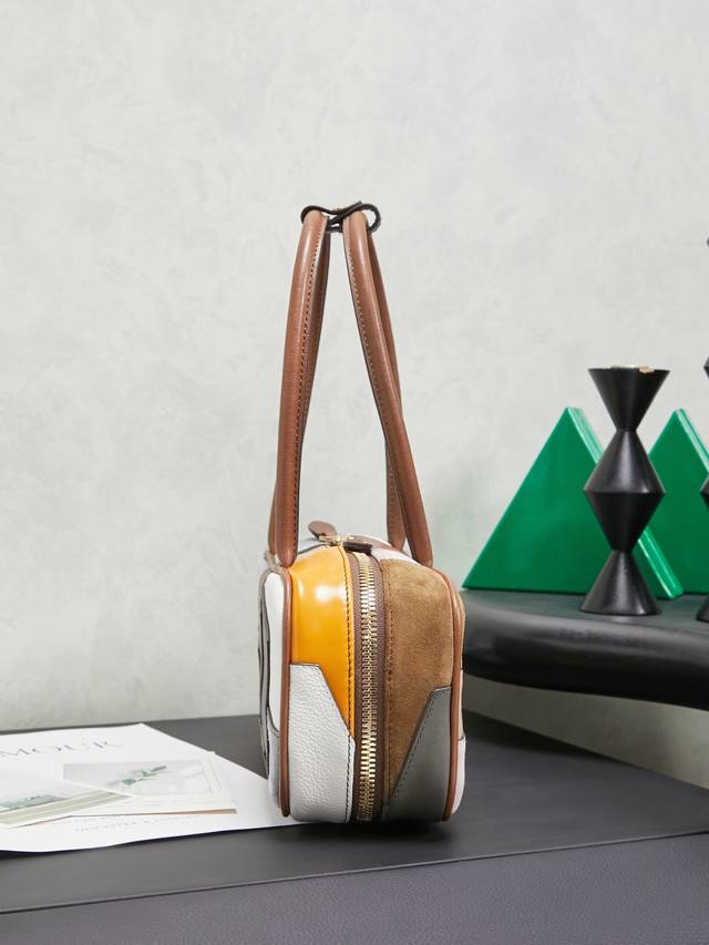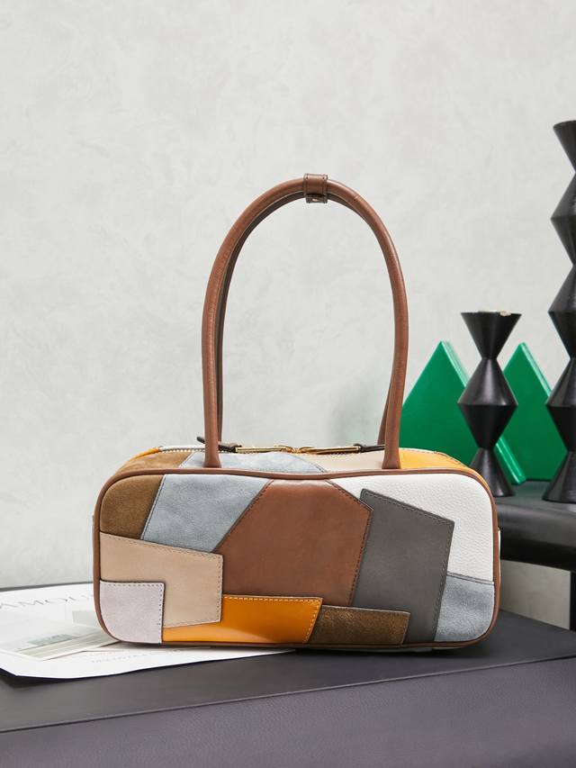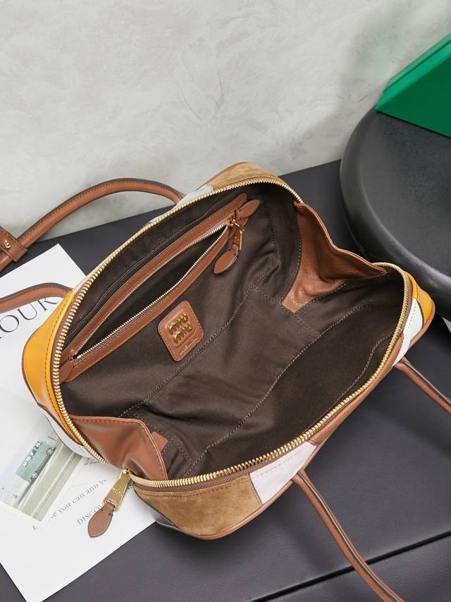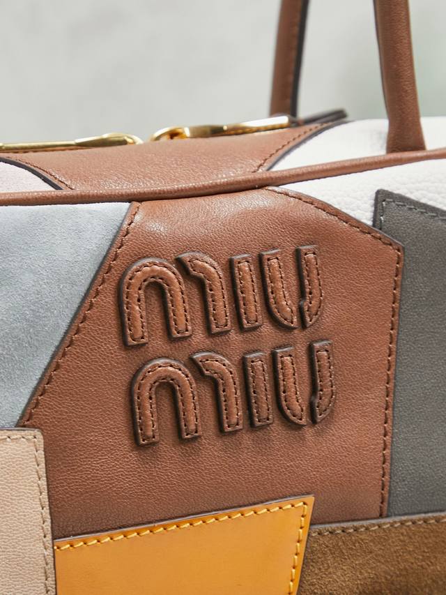 5Bb147: Miu's new patchwork bowling bag, handcrafted with various leathers, features a bold and innovative design that perfectly embodies Miu's unconventional, carefree, and inclusive attitude towards life. This bag is cool, showcasing exquisite multi-functional design, blending menswear and womenswear elements, exuding a relaxed, natural, and individualistic style. The new canvas lining has made it a hit online for good reason; many fashion bloggers and celebrities love carrying it. Dimensions: 28X12X9Cm DDD