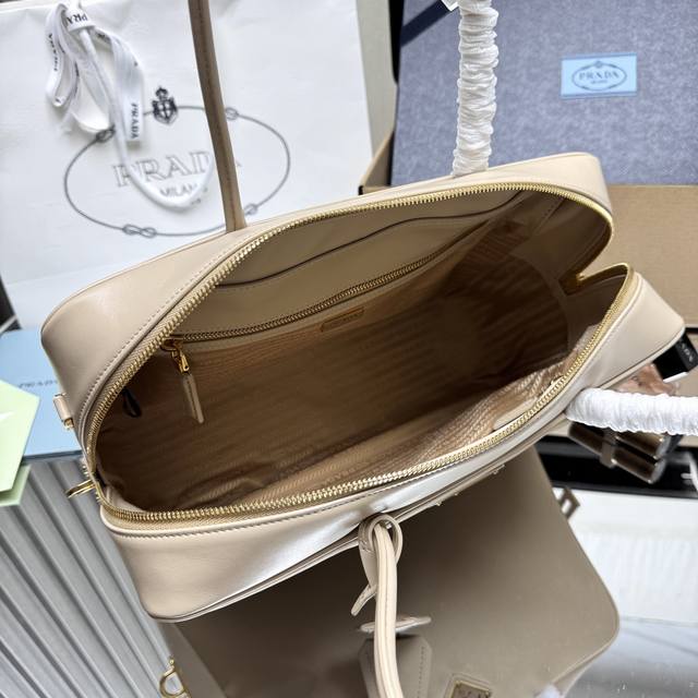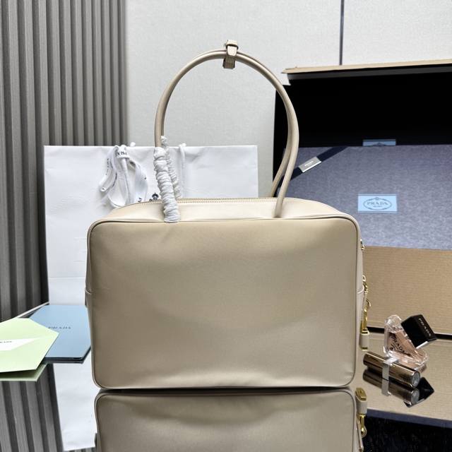 A new, original, large handbag has arrived on 1Bb131. This classic, crisp handbag is crafted from recycled nylon and leather for a refined and elegant look. Decorated with metal hardware and an enameled triangular metal logo, the zipper and padlock closure add a touch of chic. The leather handles have a 20cm drop. With ample space, it's a practical and stylish choice for both casual and cool wear. Hurry and grab yours! Dimensions: Length 34cm x Height 23cm x Base 10cm