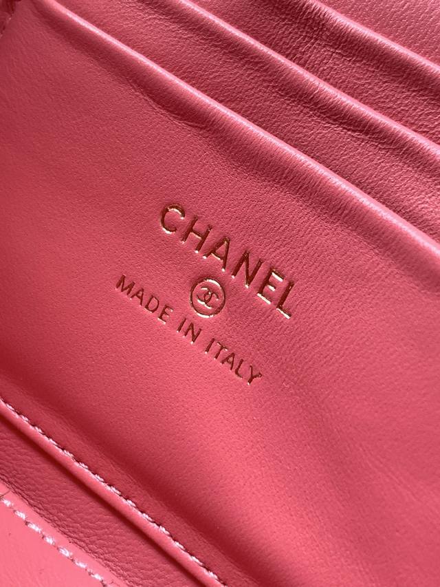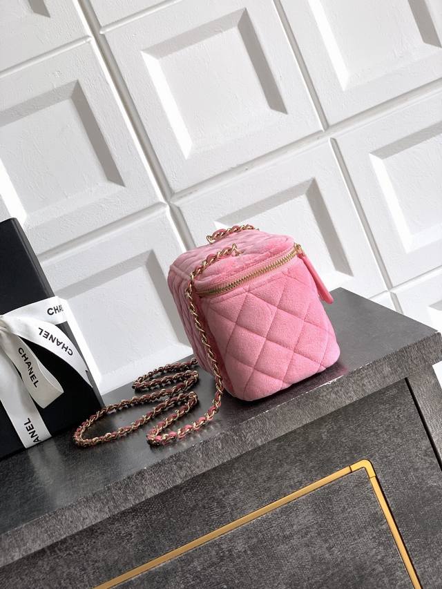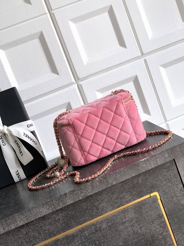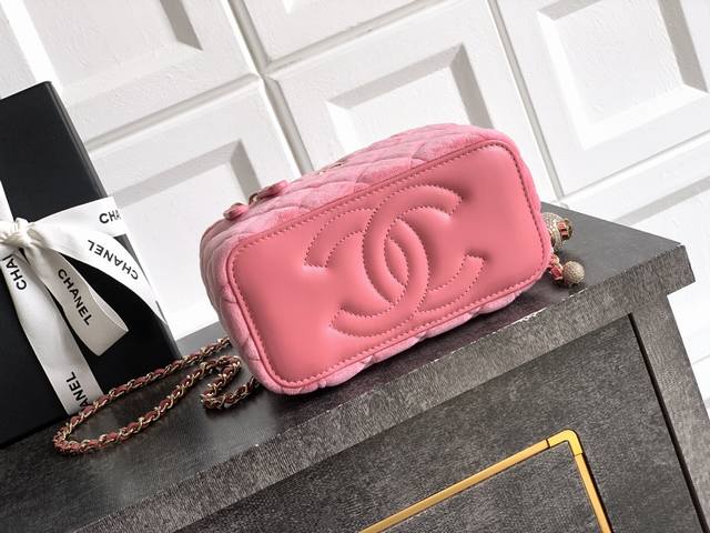 A top-tier, original pink 2303 silk, diamond, and gold bead clasp Ohanel 25B hot-selling box bag. This exquisite, chic, chain-linked small vanity case can fit a phone, boasting impressive storage and practicality. It comes with three card slots, leaving plenty of room for a card holder. The full leather lining includes a small mirror, a thoughtful detail, and a large logo stitched on the bottom. The adjustable chain allows for multiple lengths and carry options. I absolutely love this one, and it's a surefire way to carry it. Sizes: 9.5 x 17 x 8 cm.