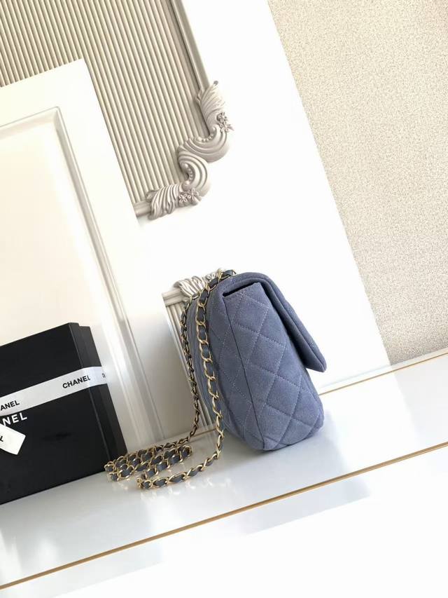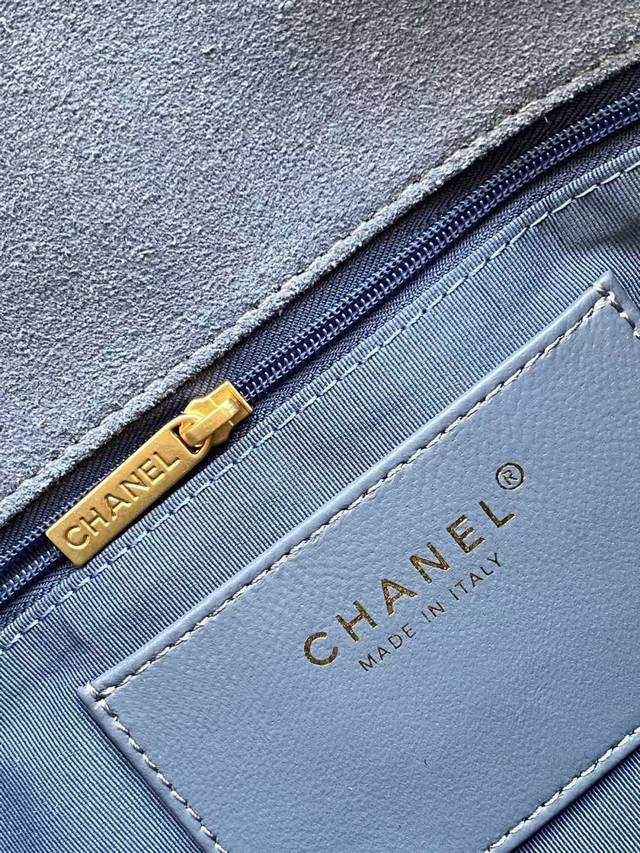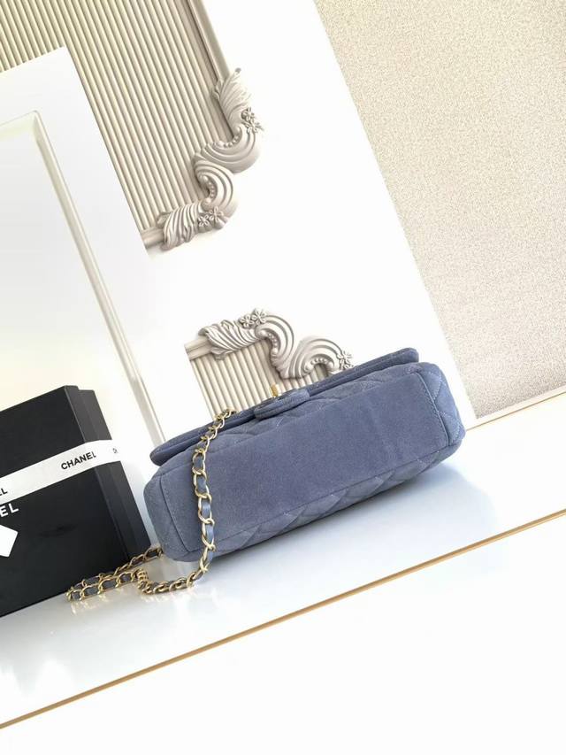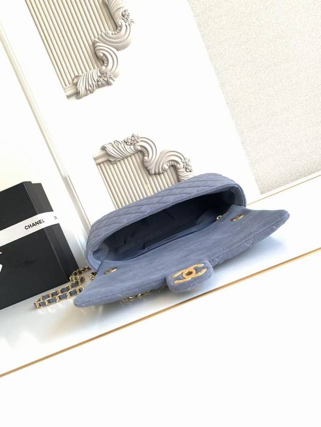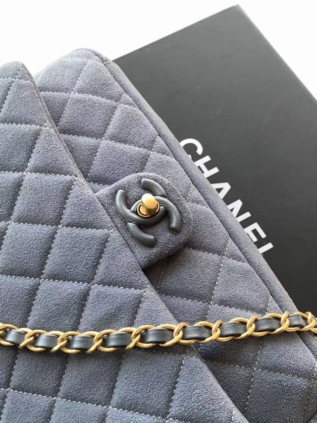 As5987 Large 26C series blue suede CF bag, classic quilted pattern + light gold hardware, retro yet sophisticated! The suede is soft and delicate, perfect for autumn and winter. The chain strap design makes it suitable for shoulder or crossbody wear. The size is just right, super practical for everyday outings. The 26C series color scheme and materials have a vacation vibe, a must-have for fashionistas! Dimensions: 18X26X7Cm