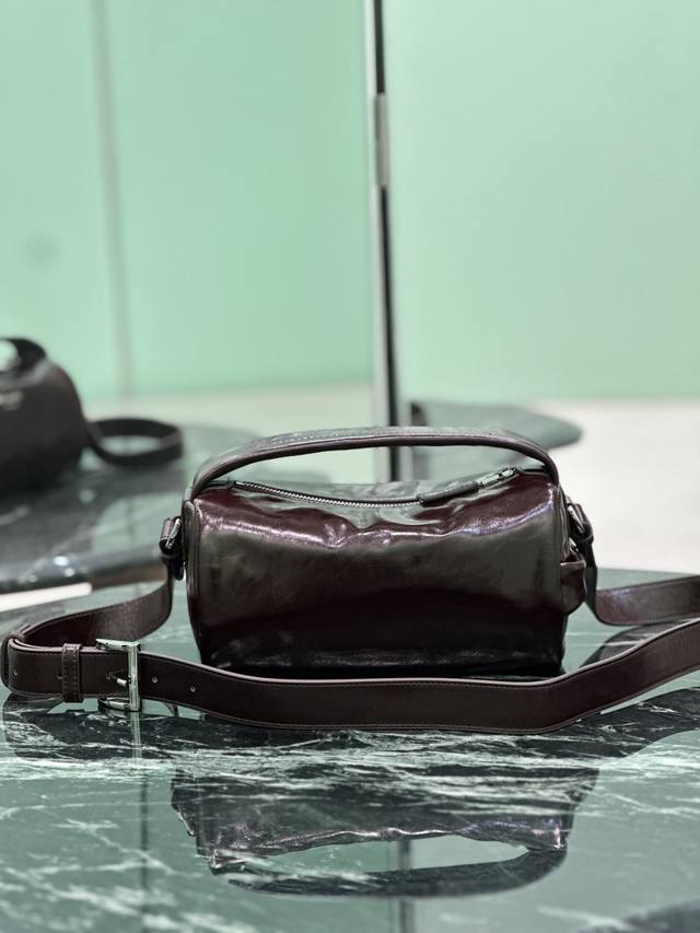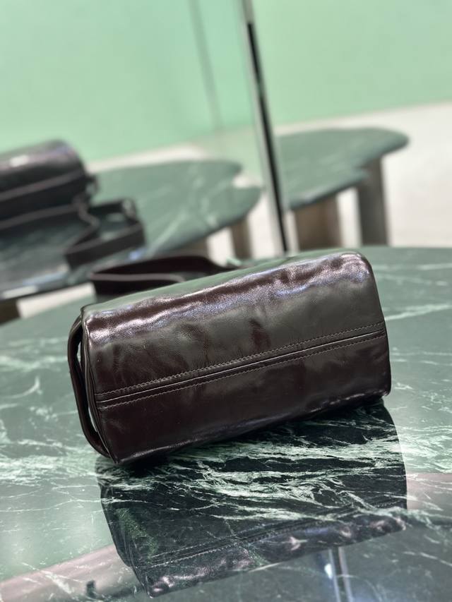 Authentic Boston Waxed Leather Bag. This stylish and compact Boston handbag draws inspiration from vintage designs and details. The waxed cowhide leather has a glossy finish, giving the accessory a soft and unique look, further accented with a metal letter logo. It comes with a detachable long shoulder strap and offers ample storage space. Dimensions: Length 24cm x Height 11cm x Base 11cm. Style Number: 2Vh188
