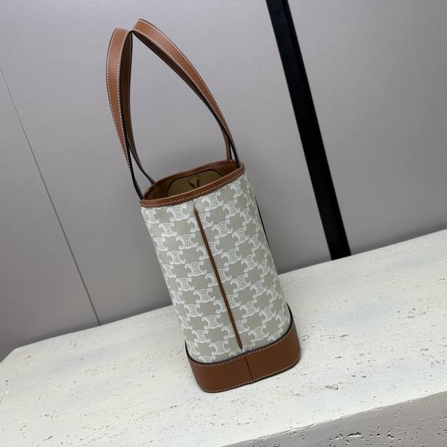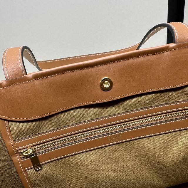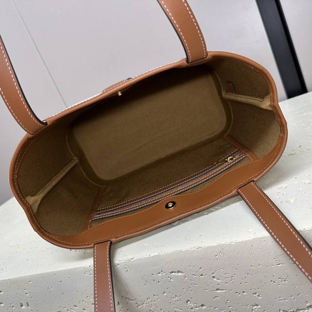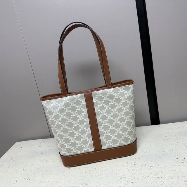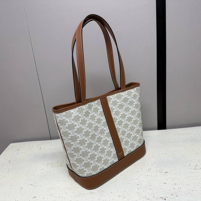 Authentic Cabas Small Logo Print Calfskin Handbag, 10 x 9 x 5 inches (26.5 x 23 x 12 cm) . This model can hold up to an 11-inch iPad. Features include Triomphe Canvas logo print, calfskin leather trim, fabric lining, gold-tone finish, shoulder and hand carry, snap closure, one main compartment, one interior zip pocket, and 8-inch (21.5 cm) handles. Item Number: 115082