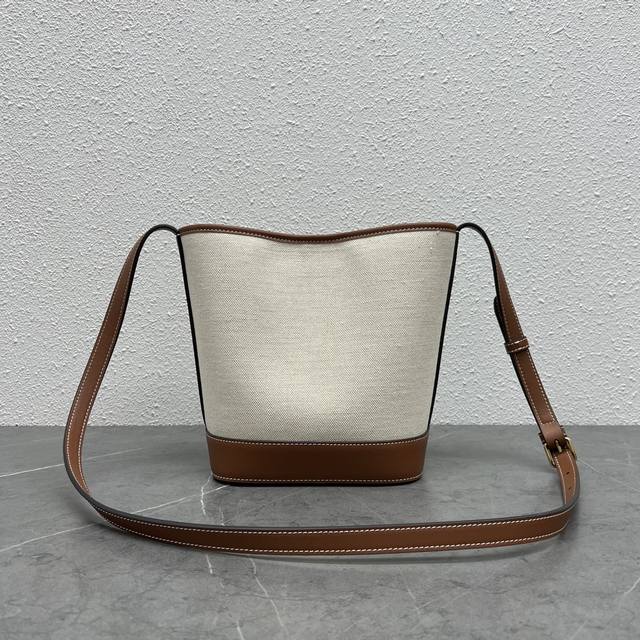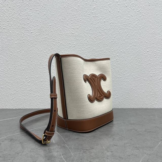 Ce Cuir bucket bag, new for spring and summer, features a large, 3D Arc de Triomphe logo for a sophisticated and sophisticated look. The leather and linen fabric create a premium feel, with a leather base and a lightweight upper. The shoulder strap is adjustable, and the bag features buttons inside for crossbody wear. Highly recommended for students and mothers alike, this bag has ample storage for everyday wear.