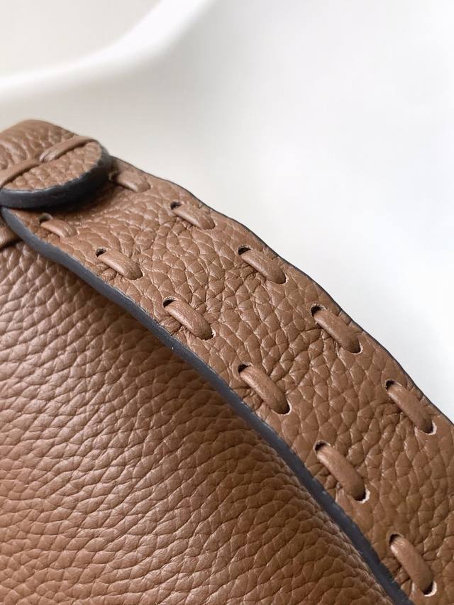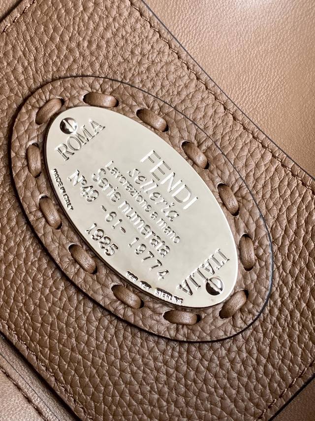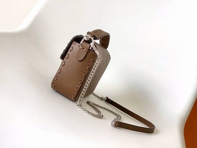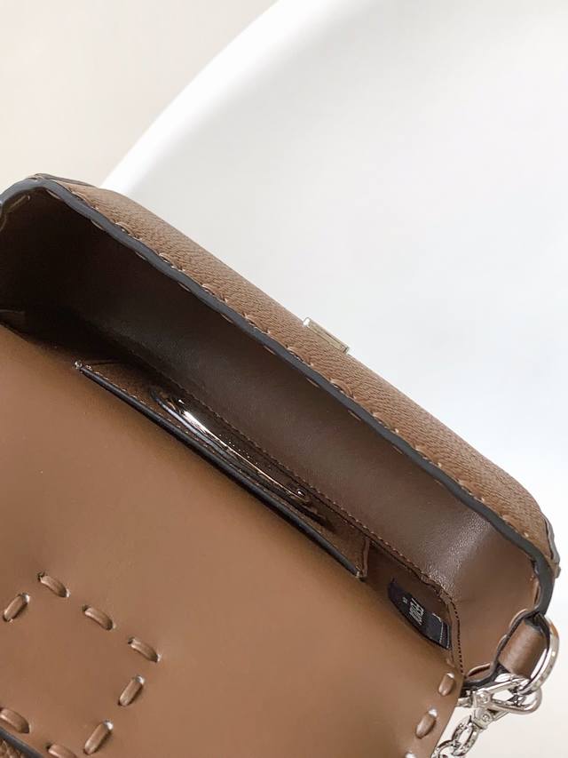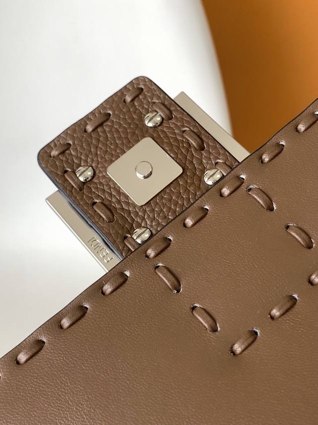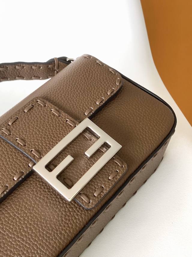 Authentic Ddd Coffee Ddd Small Baguette Bag, made of pebbled calfskin leather with large, hand-stitched silver-plated hardware in the same color scheme. Adorned with an Ff buckle. The bag features handles and a detachable shoulder strap for hand-carrying or shoulder-carrying. Size: 20-5-13Cm Ddd Style Number: 600S DDD