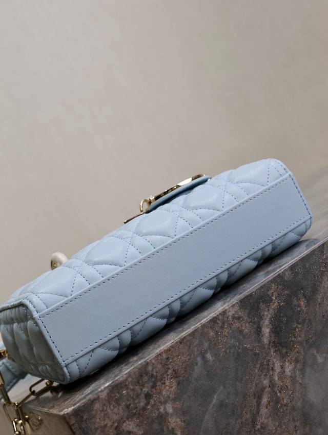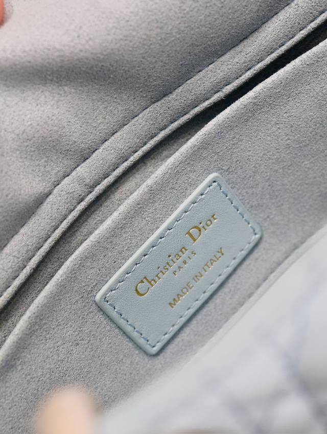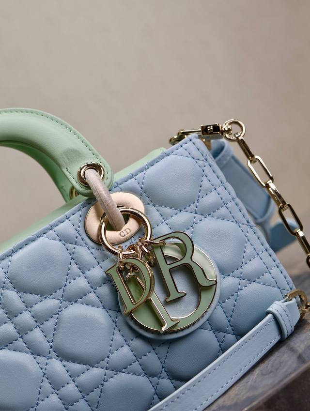 Authentic, high-quality replica Lady Dior bag, light blue and light green, small size. Many people are likely drawn to this narrow version of the Lady Dior bag. A hugely popular item, this bag comes with two shoulder straps of different lengths, allowing for multiple carrying options: crossbody or underarm. It looks beautiful and stylish. The classic quilted design, paired with soft lambskin, is elegant and fashionable. Size: 22.5