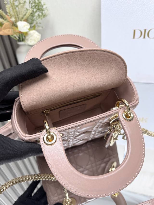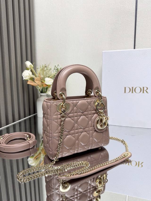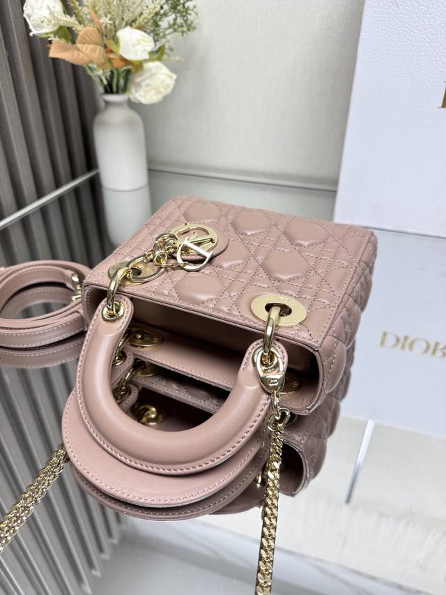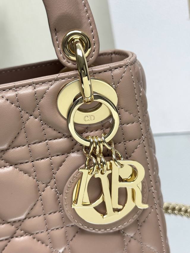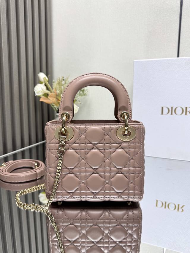 Authentic, High-Quality Version. Classic Lady Dior Three-Compartment Powder Pink Lambskin Bag, Model 0505. This Lady Dior bag combines elegant temperament with modern style. The entire bag is made of exquisite lambskin, decorated with enamel lettering and gold accents. It comes with a detachable shoulder strap. Elegant and practical, the capacity meets daily storage needs. It's also very lightweight. A must-have for fashionistas. Perfect details rival those in boutiques. Superb! 5 reviews. Size: 17*15*7Cm.