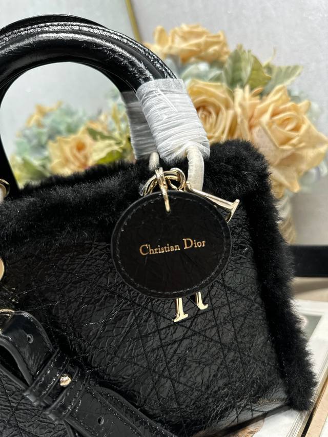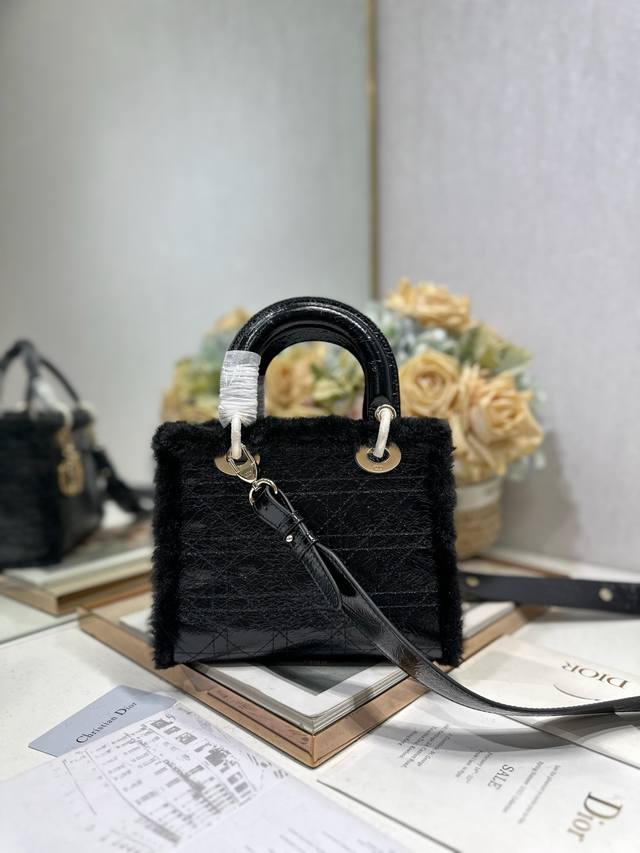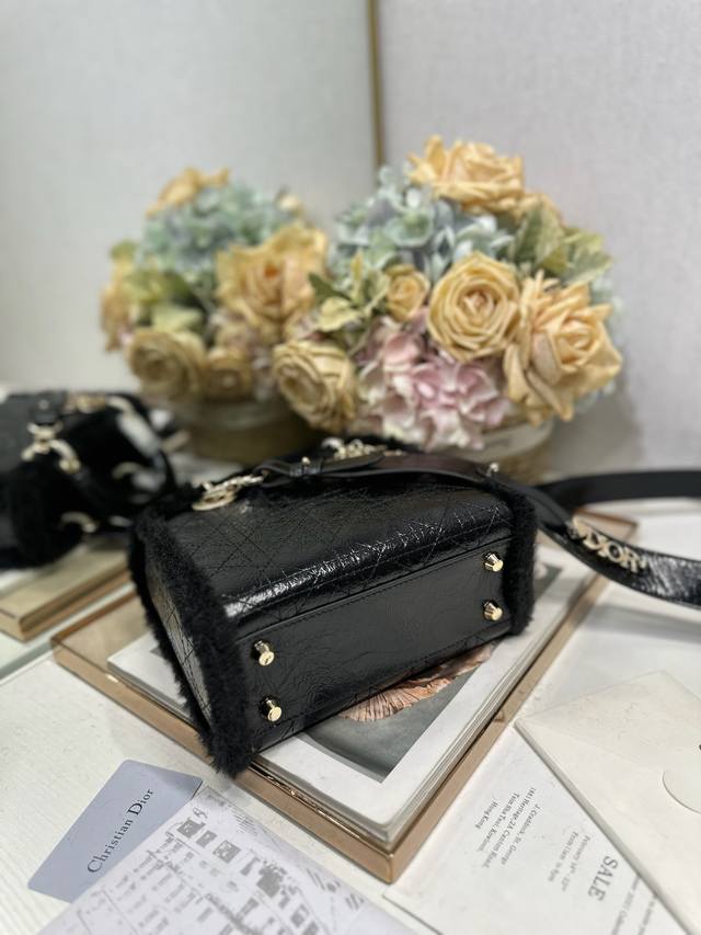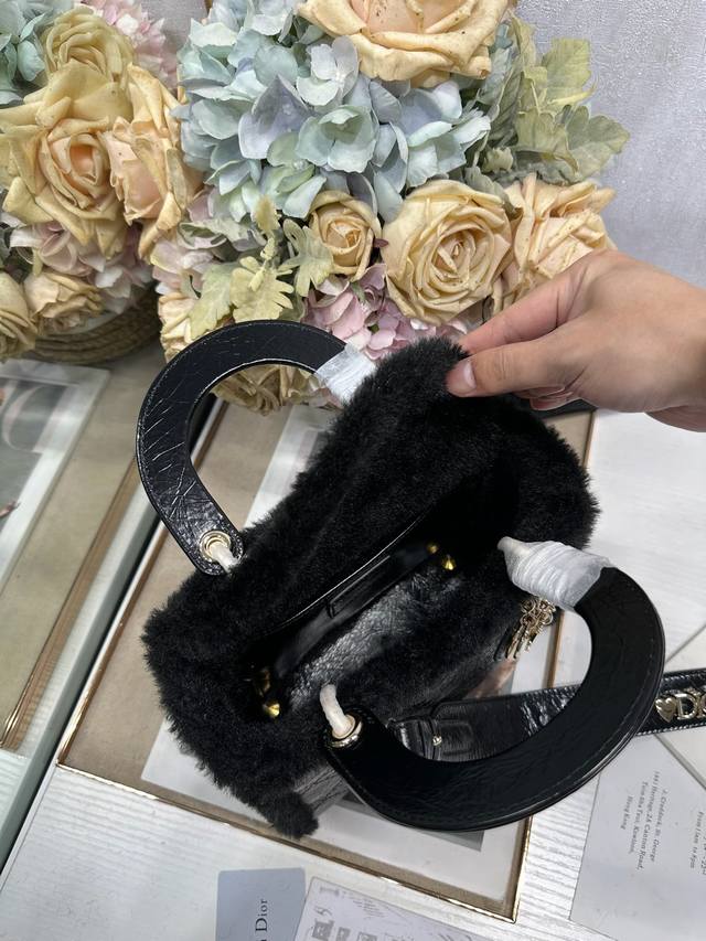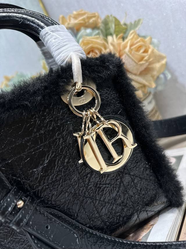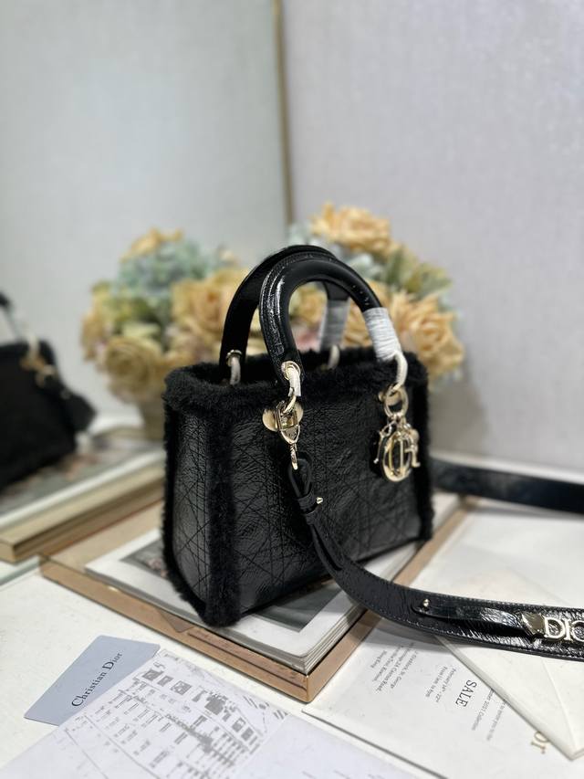Authentic, High-Quality Version DDD Small Lady Dior Four-Compartment Handbag, Black with Black Fur Trim DDD This Lady Dior handbag embodies Dior's profound insight into elegance and beauty. Its chic and elegant design is timeless. Crafted from black suede with cannage stitching and black cowhide shearling, it showcases Dior's exquisite craftsmanship. A light gold-tone Dior charm adds a touch of dynamism to its refined silhouette. The mini size, with a detachable and adjustable shoulder strap, can be carried by hand or crossbody, making it the perfect companion for evening wear. DDD Detachable and Adjustable Shoulder Strap DDD Interior Zippered Pocket DDD Can be paired with other Dior embroidered shoulder straps DDD Model: 0538 DDD Dimensions: 20 x 17 x 8 cm (Length x Height x Width) DDD Can hold 1 wallet, 1 mobile phone, and sunglasses DDD
