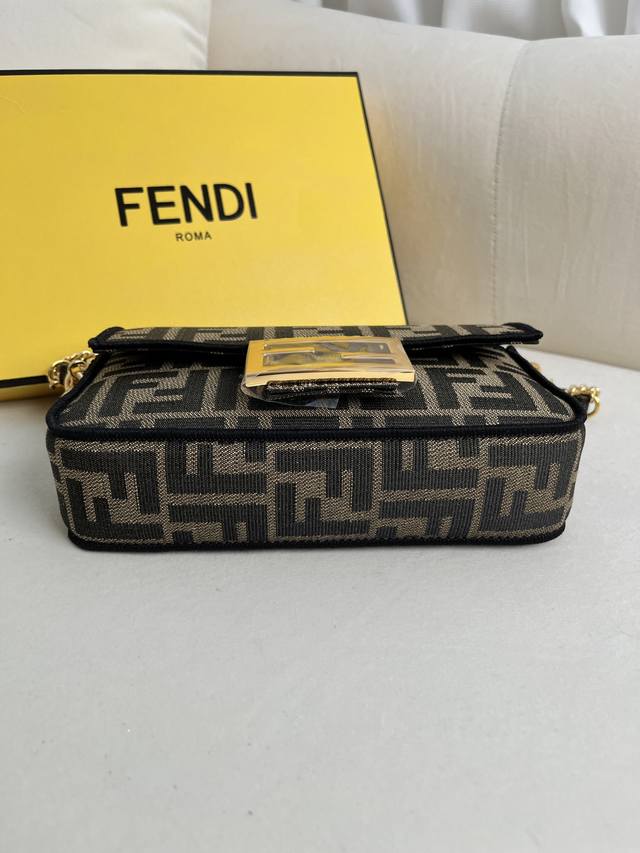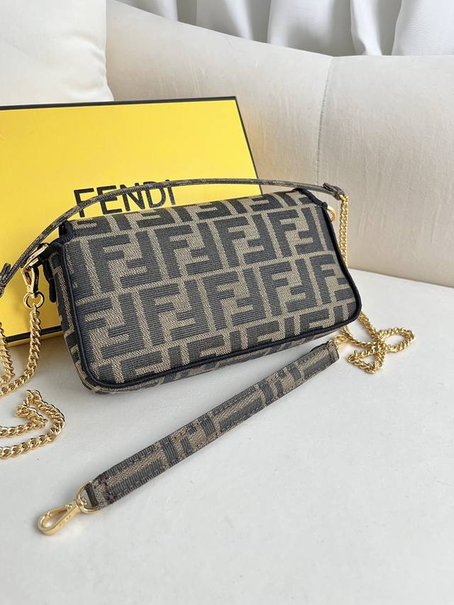 Authentic Mini Baguette Bag in Brown Fabric. More details: Iconic Baguette mini handbag in brown jacquard fabric with an Ff pattern, Ff clasp, and black embroidered trim. Features a front flap, magnetic closure, unlined interior compartments, pockets, and gold-tone hardware. The bag comes with a detachable handle and chain shoulder strap for hand-carrying, shoulder-carrying, or crossbody wear. Made in Italy. Material: Outer fabric: Fabric; Lining: Fabric. Depth: 4 cm. Length: 19 cm. Height: 11.5 cm. Style Number: 102.