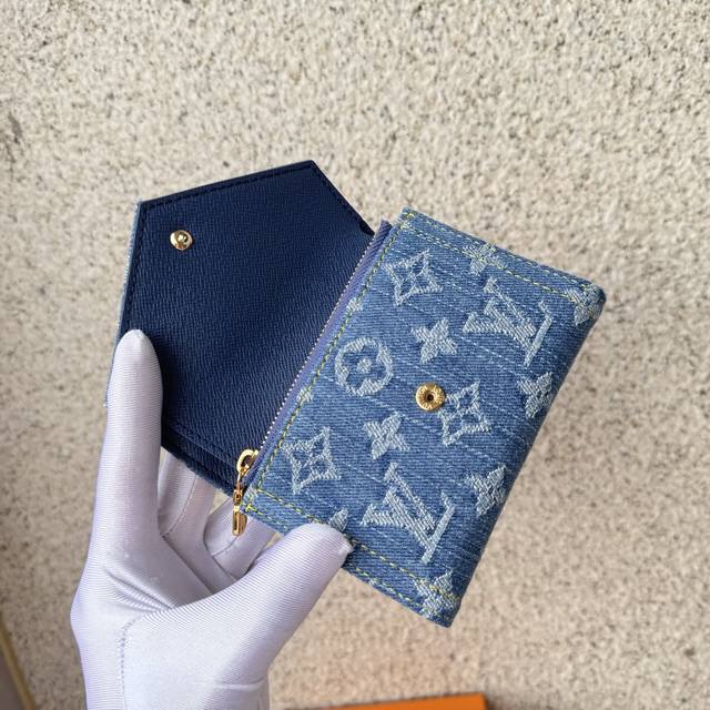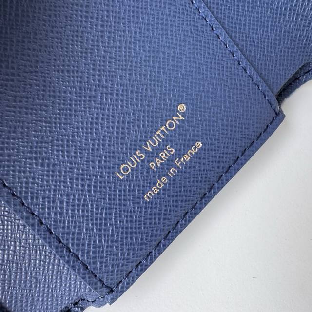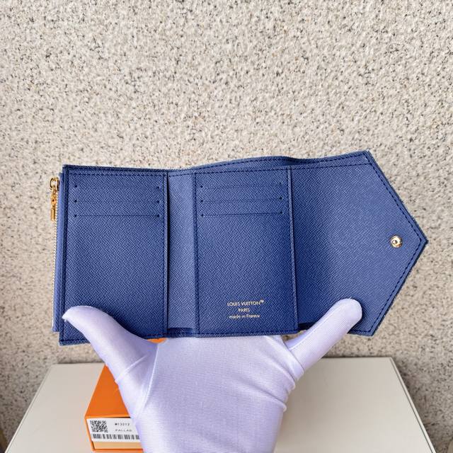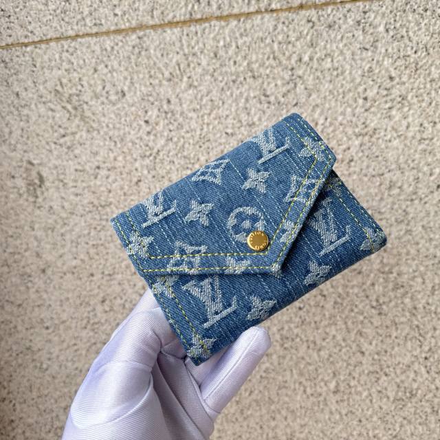 Premium original M13212 Monogram Denim collection introduces this seasonal edition of the Victorine wallet in a vibrant blue hue. Made from organic cotton and lined with leather, it features multiple pockets and slots for securing cards, bills, and coins. Gold-tone press-fit rivets add a touch of sophistication. Dimensions: 12 x 2.5 x 9.5 cm.