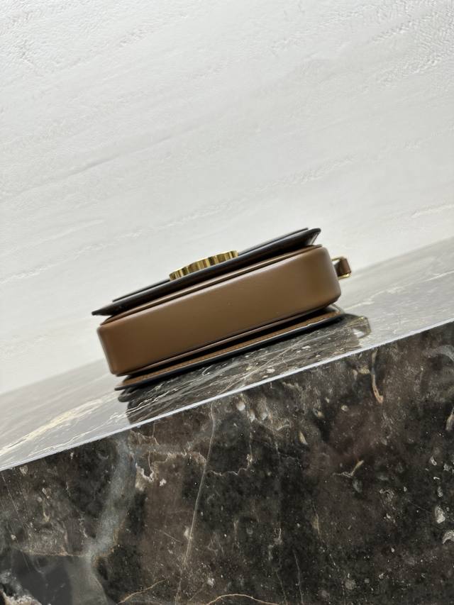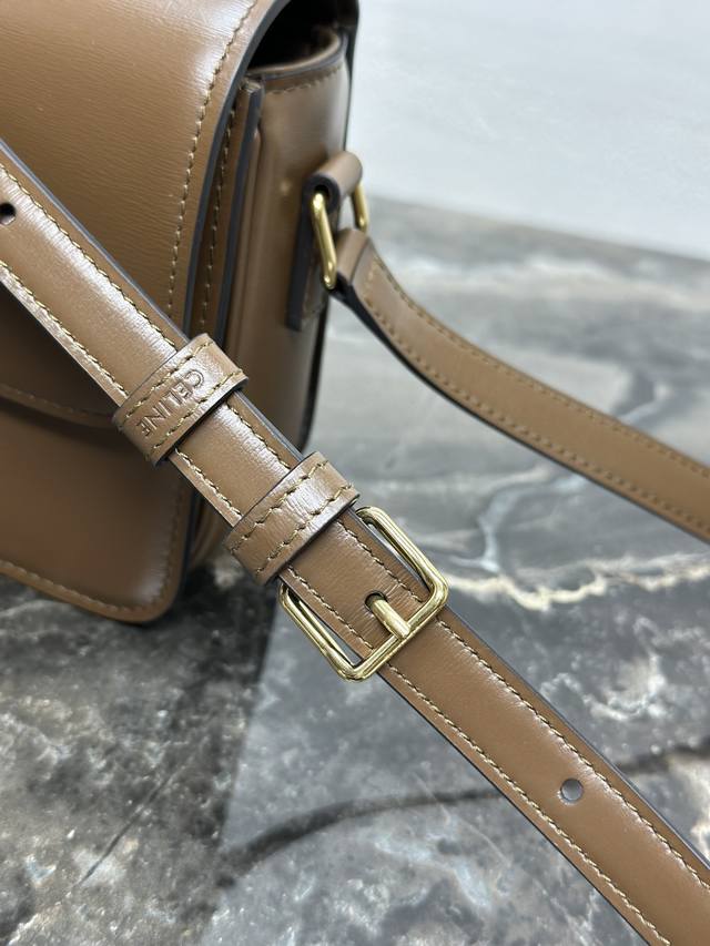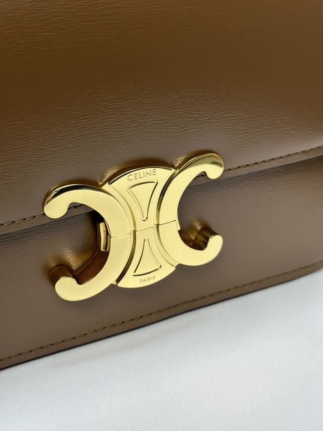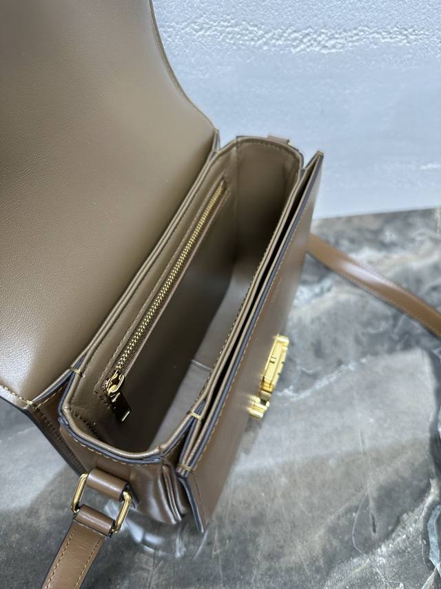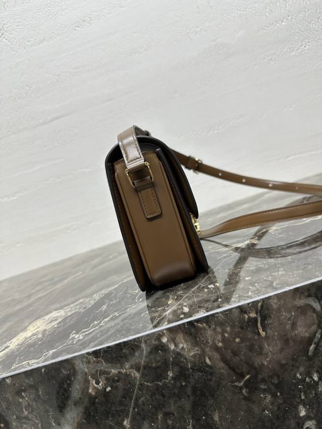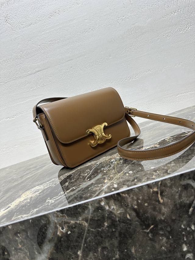 Authentic Teen Triomphe Calfskin Handbag with All-Steel Hardware. This small Triomphe handbag, crafted from hand-brushed calfskin, features an adjustable genuine leather shoulder strap and Triomphe-specific buckle. It also includes an interior zip pocket and an interior flat pocket. The adjustable leather shoulder strap measures 17 inches (42 cm) long. Dimensions: 7 x 6 x 2 inches (18.5 x 14 x 6 cm). Item Number: 188423 pj880