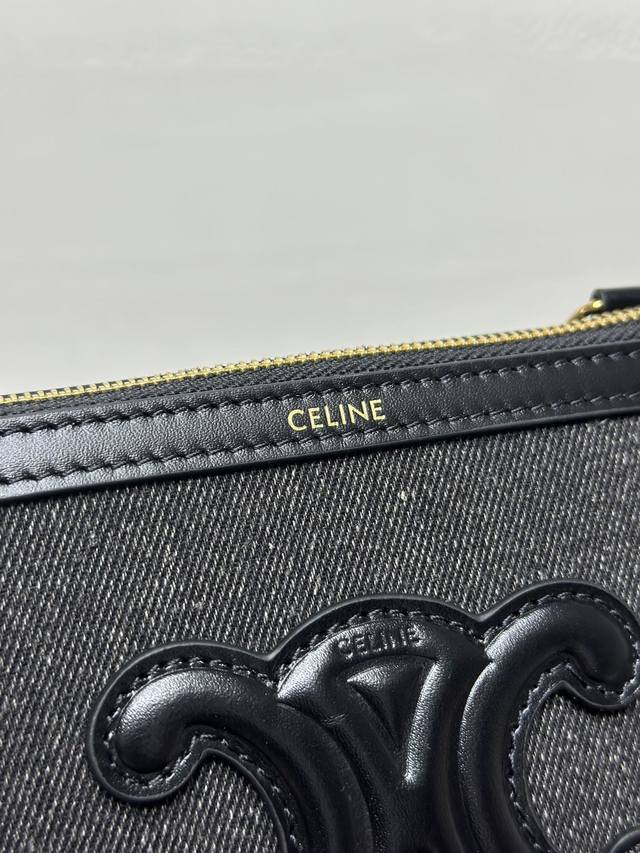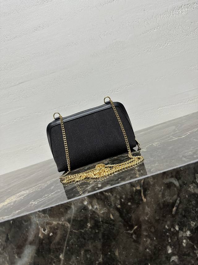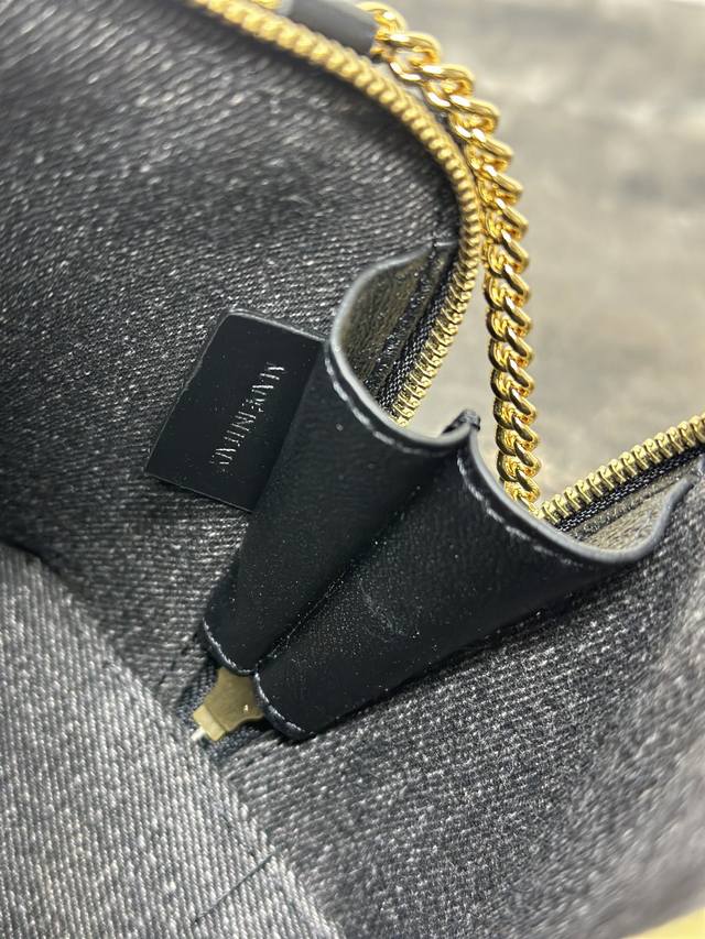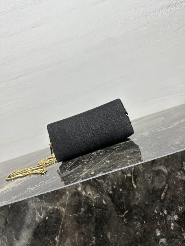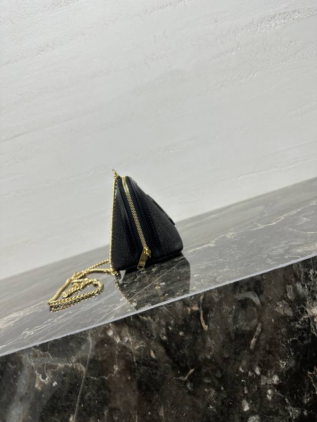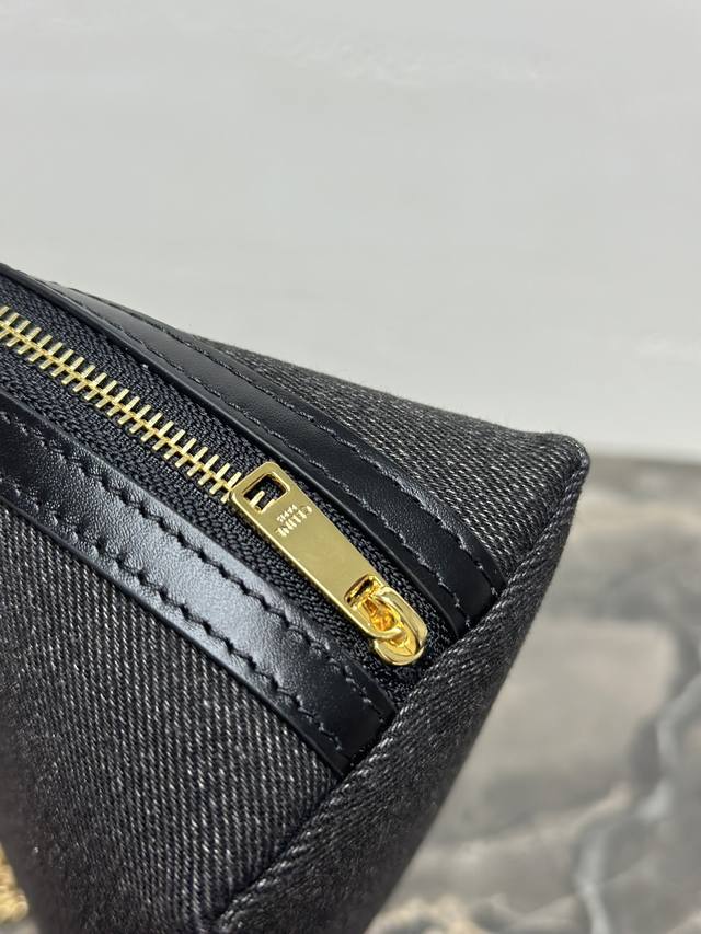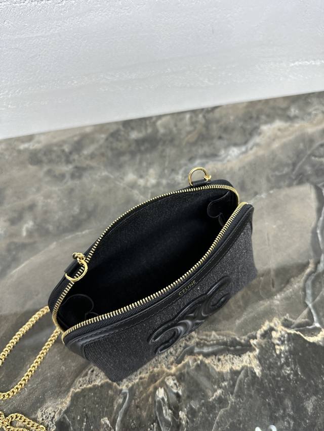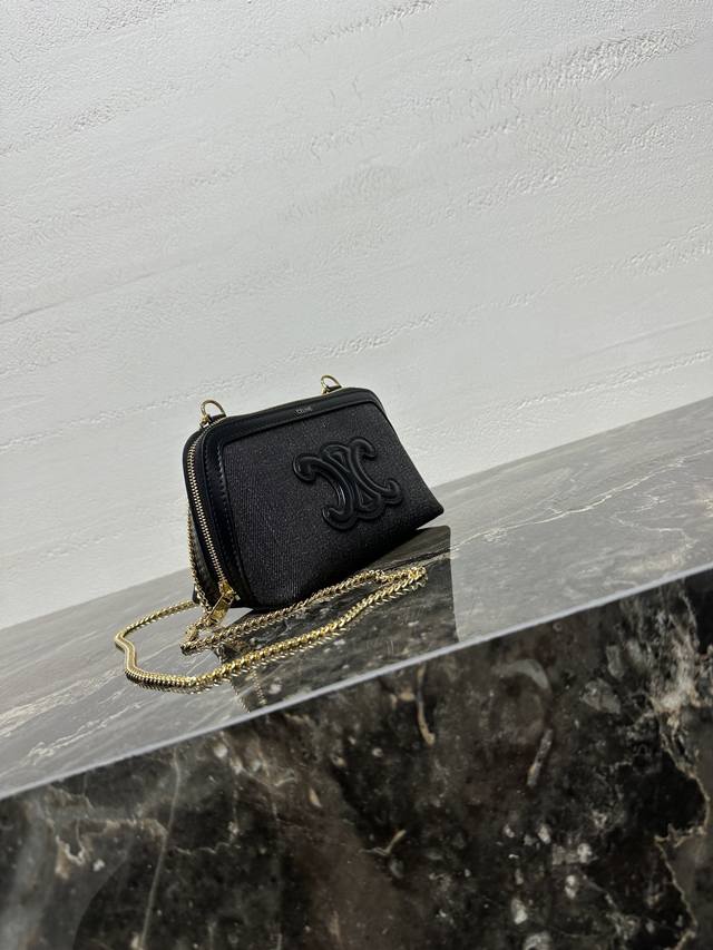 Authentic Ddd Triomphe Chain Handbag, Mini Handbag. This model cannot fit larger smartphones (plus size). Dimensions: 6.5 x 4.3 x 3.1 inches (16.5 x 11 x 8 cm). Material: Fabric cowhide leather, denim lining, gold finish. Can be worn crossbody or over the shoulder. Zip closure. One main compartment. Chain strap. Item Number: 10E382