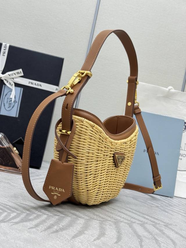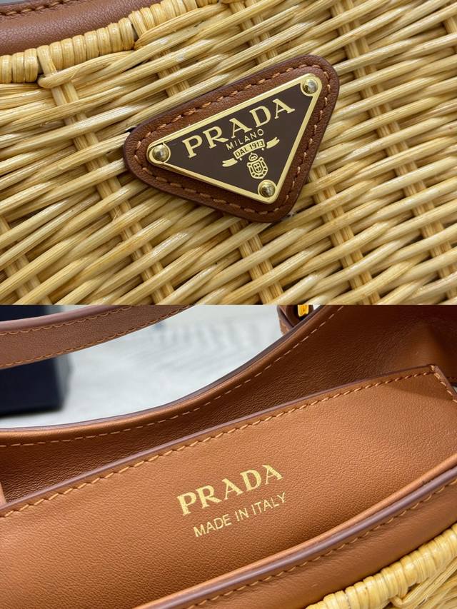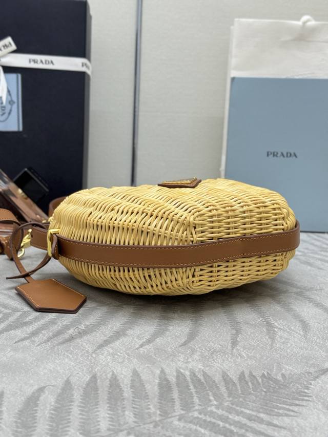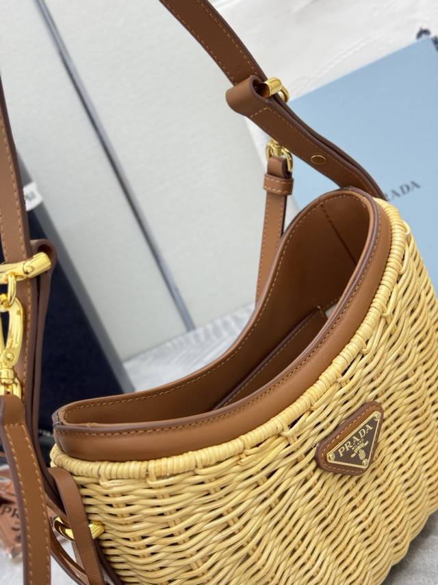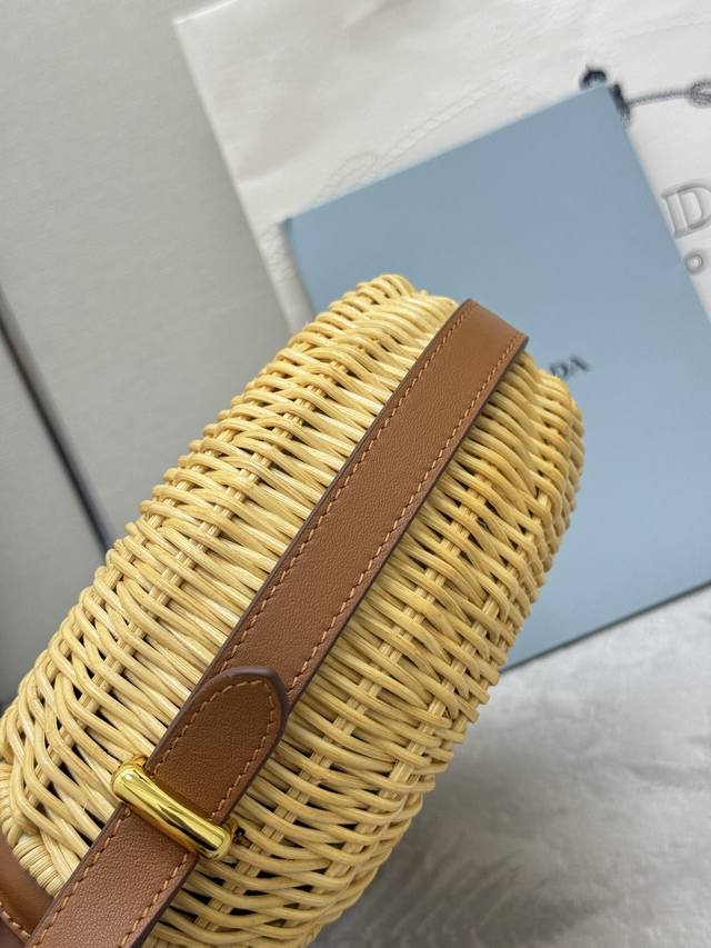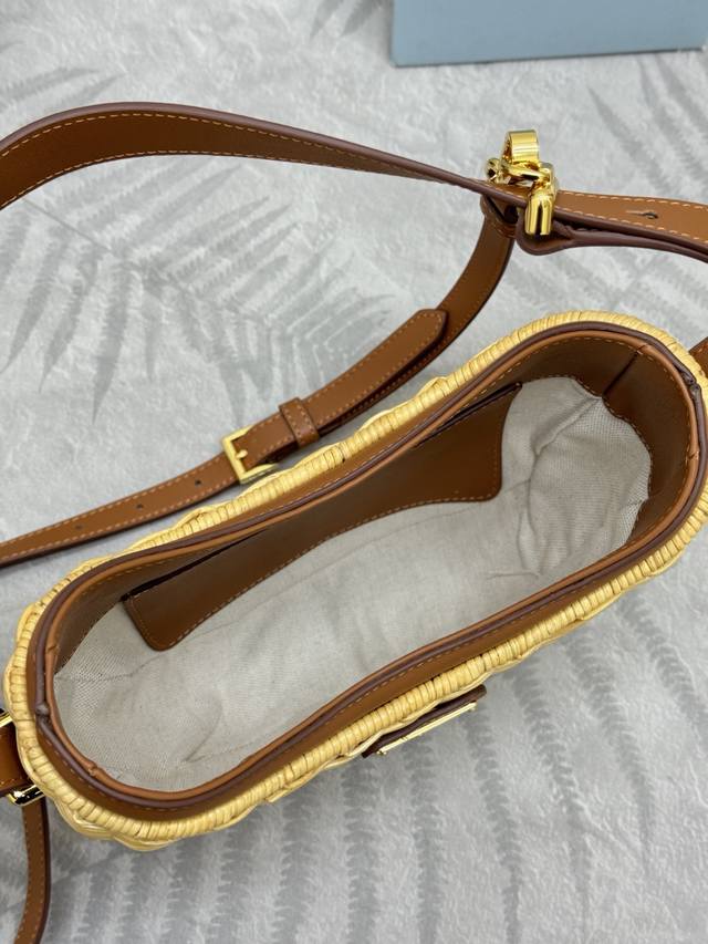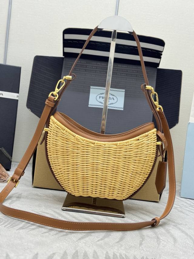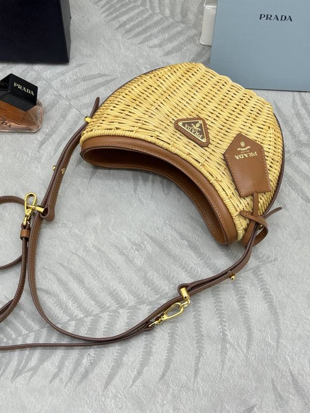 Bamboo Woven Crescent Bag 1Bc202 This new woven bag features a charmingly curved crescent shape, combining woven fabric with cowhide for a structured and unique look, and is adorned with the iconic triangular logo. Reinterpreted with a more refined design, it exudes summery charm. It includes a detachable key ring, a cleverly integrated handle shoulder strap, and a detachable cowhide shoulder strap. Grab yours now! Dimensions: Length 22.5cm * Height 18.5cm * Width 6cm