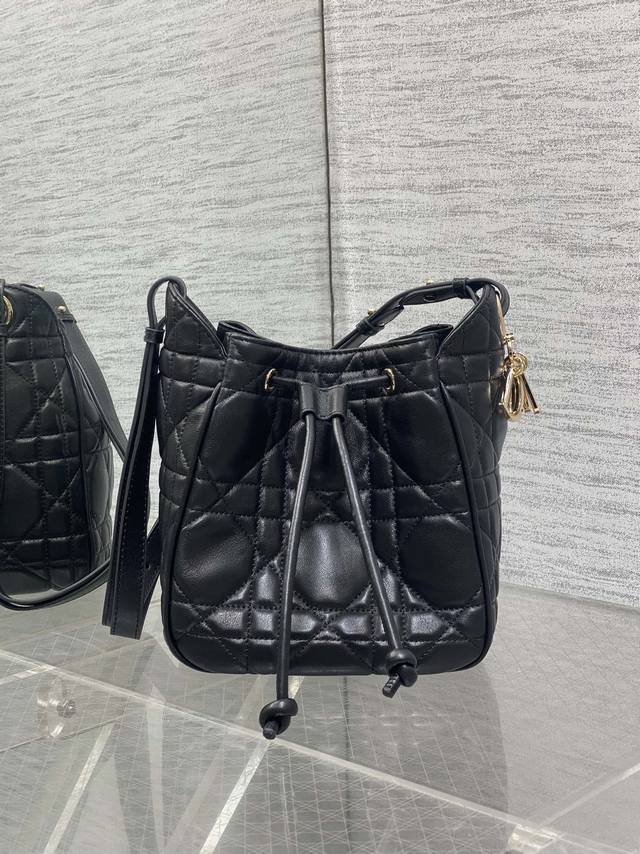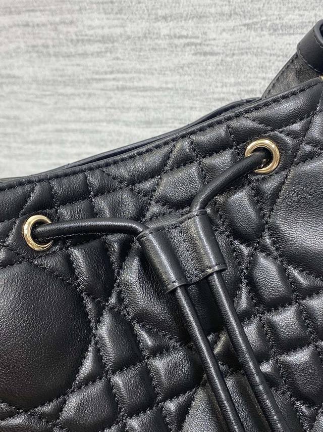 Black Small Caro Bucket Bag, Motion Series. New arrivals! Crafted from imported lambskin with exquisite workmanship, featuring a classic diamond pattern and a cute bucket bag shape. Elegant yet stylish, the soft design includes a drawstring closure and a detachable long shoulder strap, combining practicality and beauty. Perfect for a stylish holiday trip! Size: 17*19.5*11cm. (Ddd 1025 DDD)