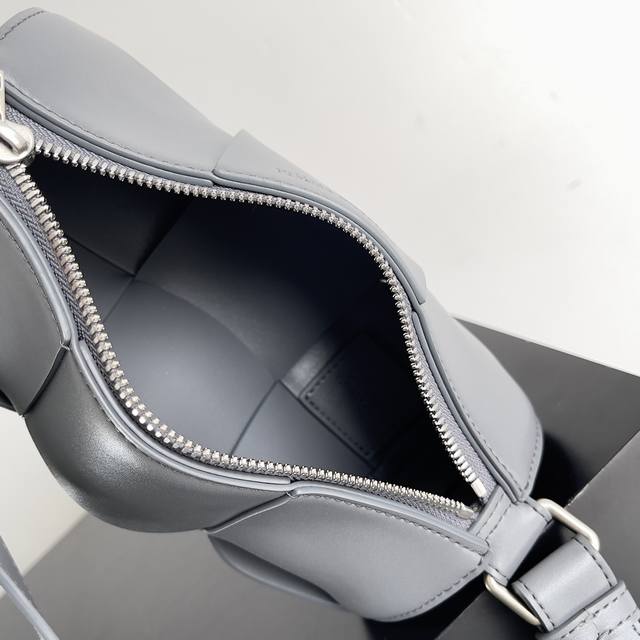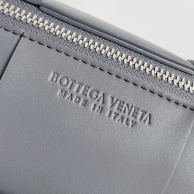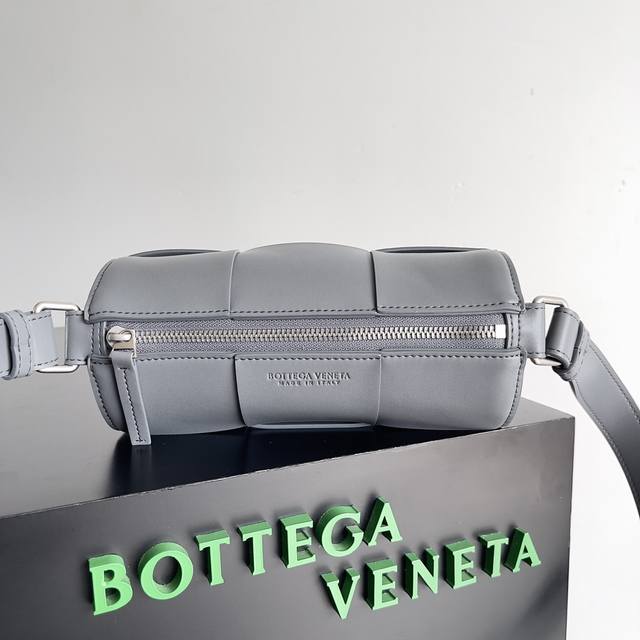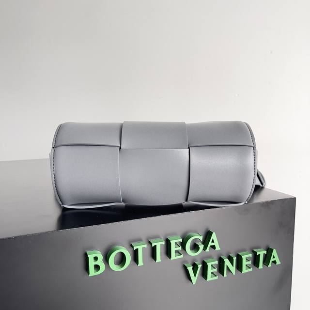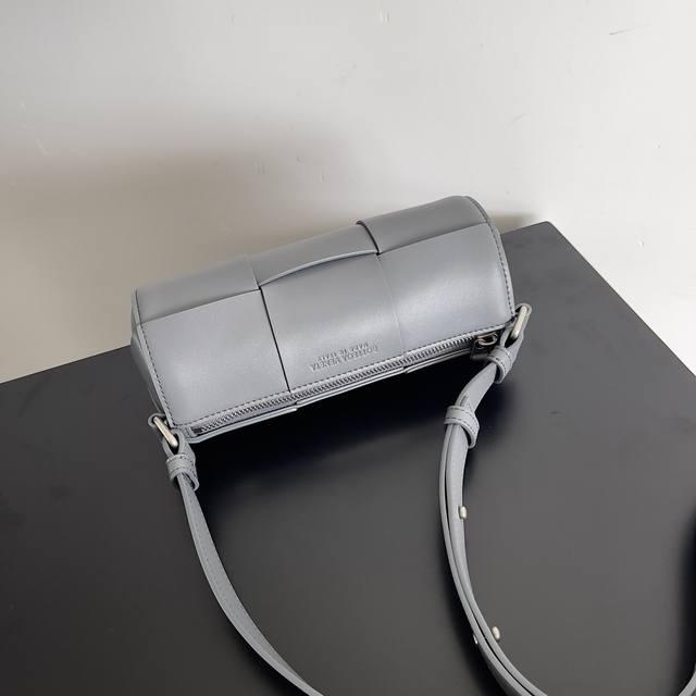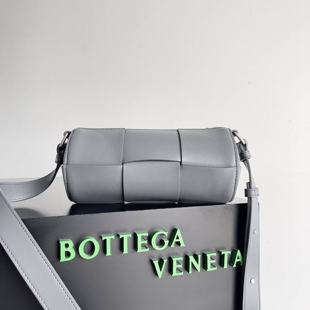 Bv's lucky bucket bag is so cute! The mini version is so adorable! The minimalist, enlarged woven design is both casual and stylish. It's a unisex small cylindrical bag. Available in multiple colors, made with imported cowhide, and features an adjustable shoulder strap. It has ample space for makeup touch-ups. Style number: 741561. Size: 22*6.5*15.5cm. Color: Lightning Grey.